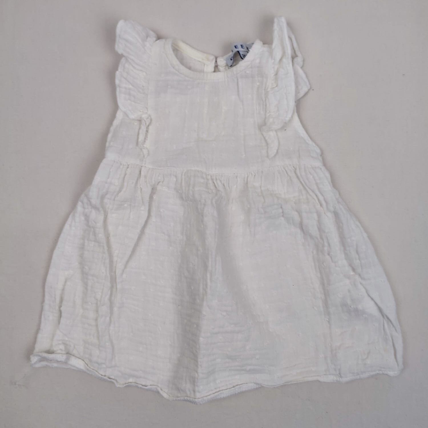 Autres commentaires : Robe blanche sans manches avec un volant sur chaque épaule et des petits pois blancs en relief, fermeture par bouton brandebourg en haut dud dos.