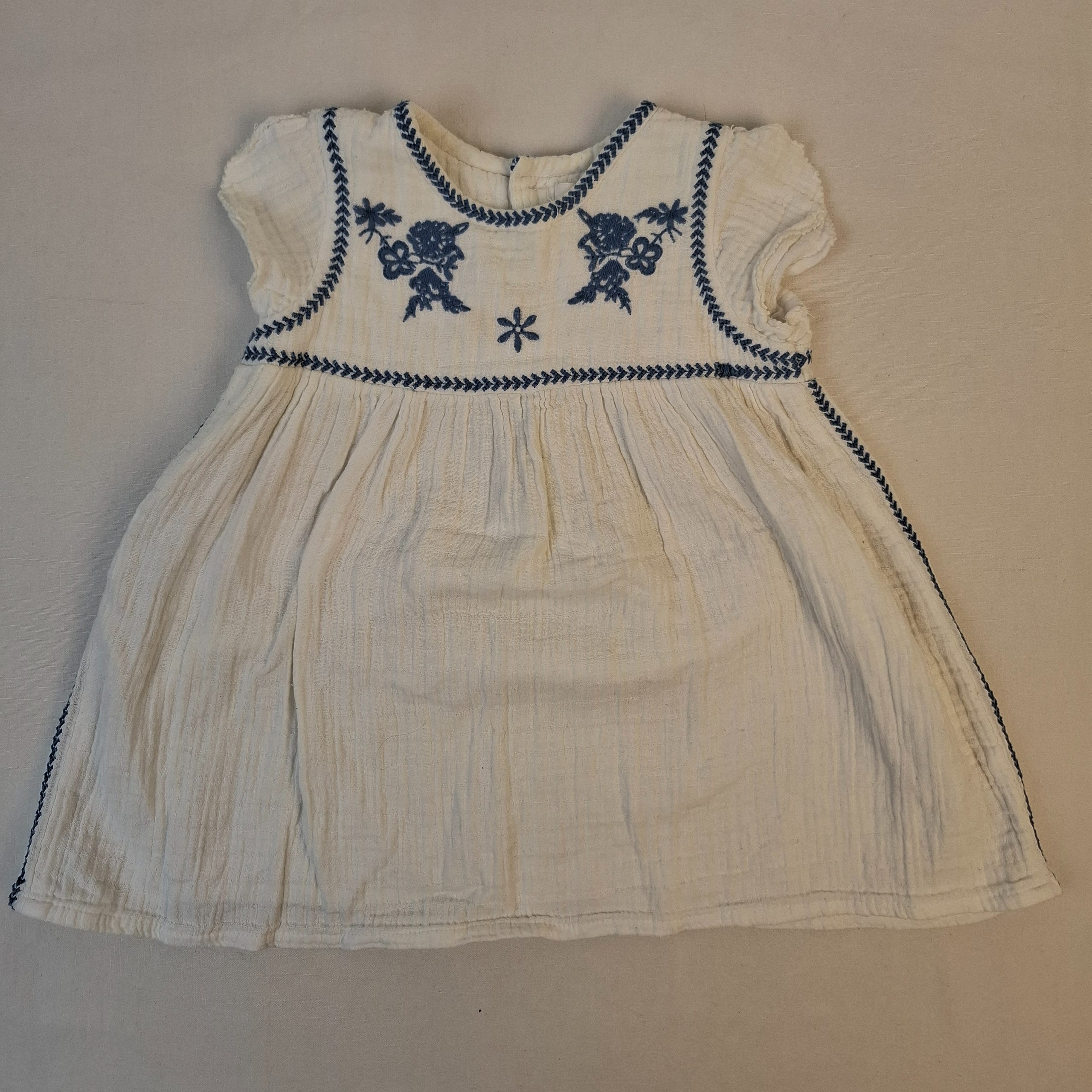 - Robe à motifs floraux bleus, fermeture boutons en haut du dos