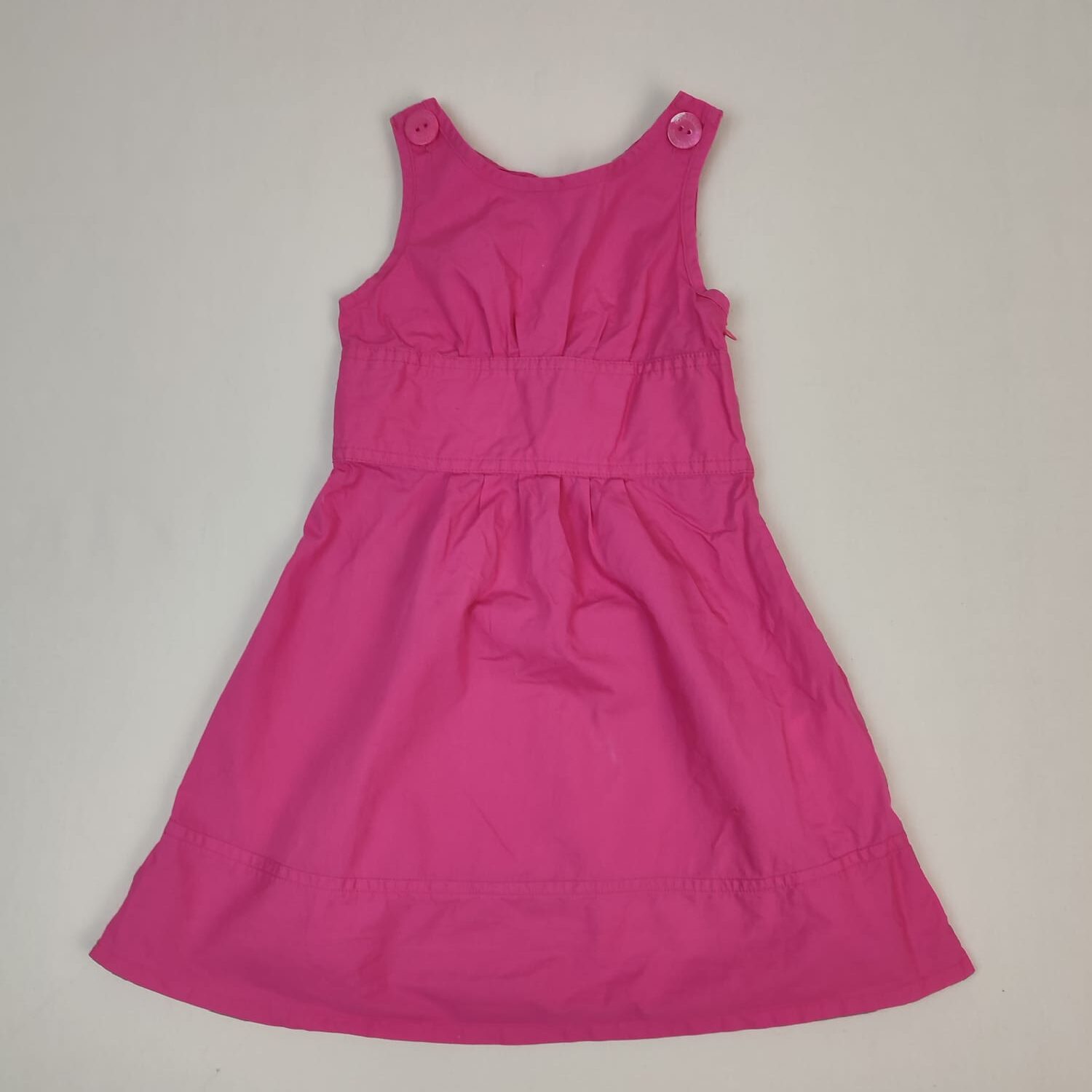 Autres commentaires : Robe sans manches fuchsia, taille haute, légèrement froncée, fermeture latérale par zip et par boutons au niveau des épaules, semi dos-nu en forme de noeud. .
