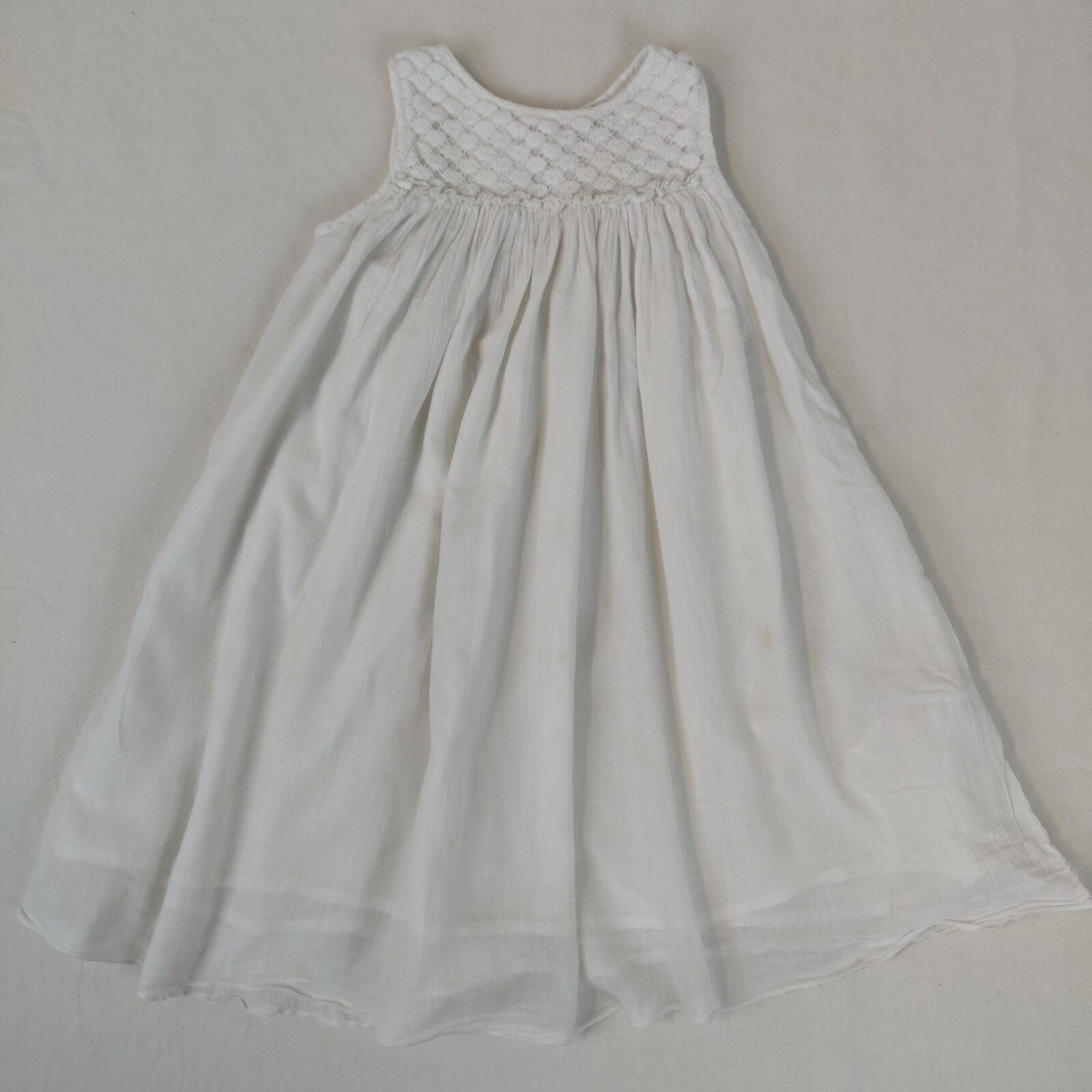 Autres commentaires : Robe sans manche doublée – blanc. Partie supérieure en broderie. Taille haute marquée et froncée. Echancrure au dos à un bouton. Tâche marronnée discrète sur la partie broderie et des tâches marronées dans le bas de la jupe sur le devant et l’arrière. Niveau réduit de fraise à myrtille.