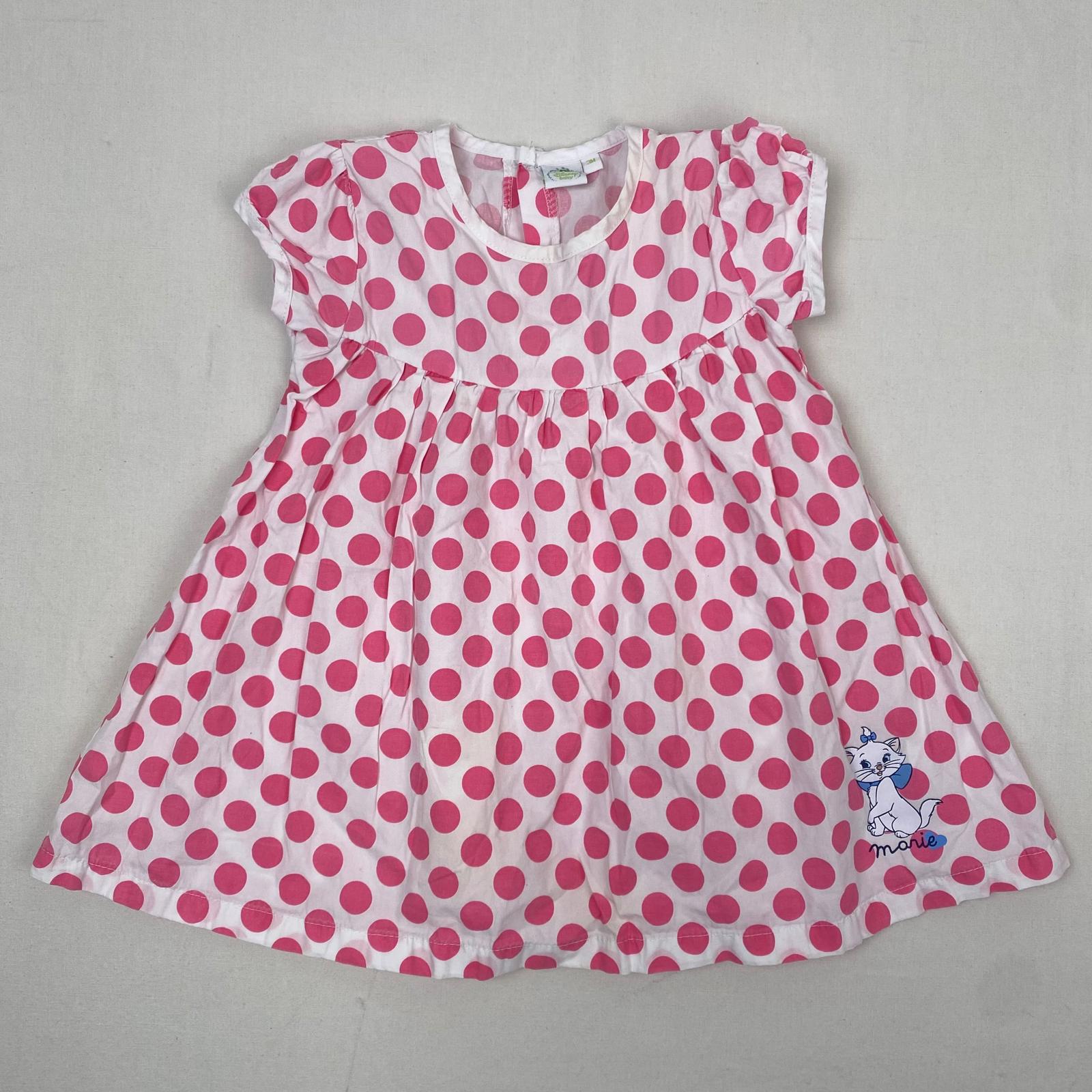 Autres commentaires : Robe à manches courtes blanches à pois roses avec un motif de chat en bas à gauche, col rond, petit defaut : tache en dessous de la poitrine.