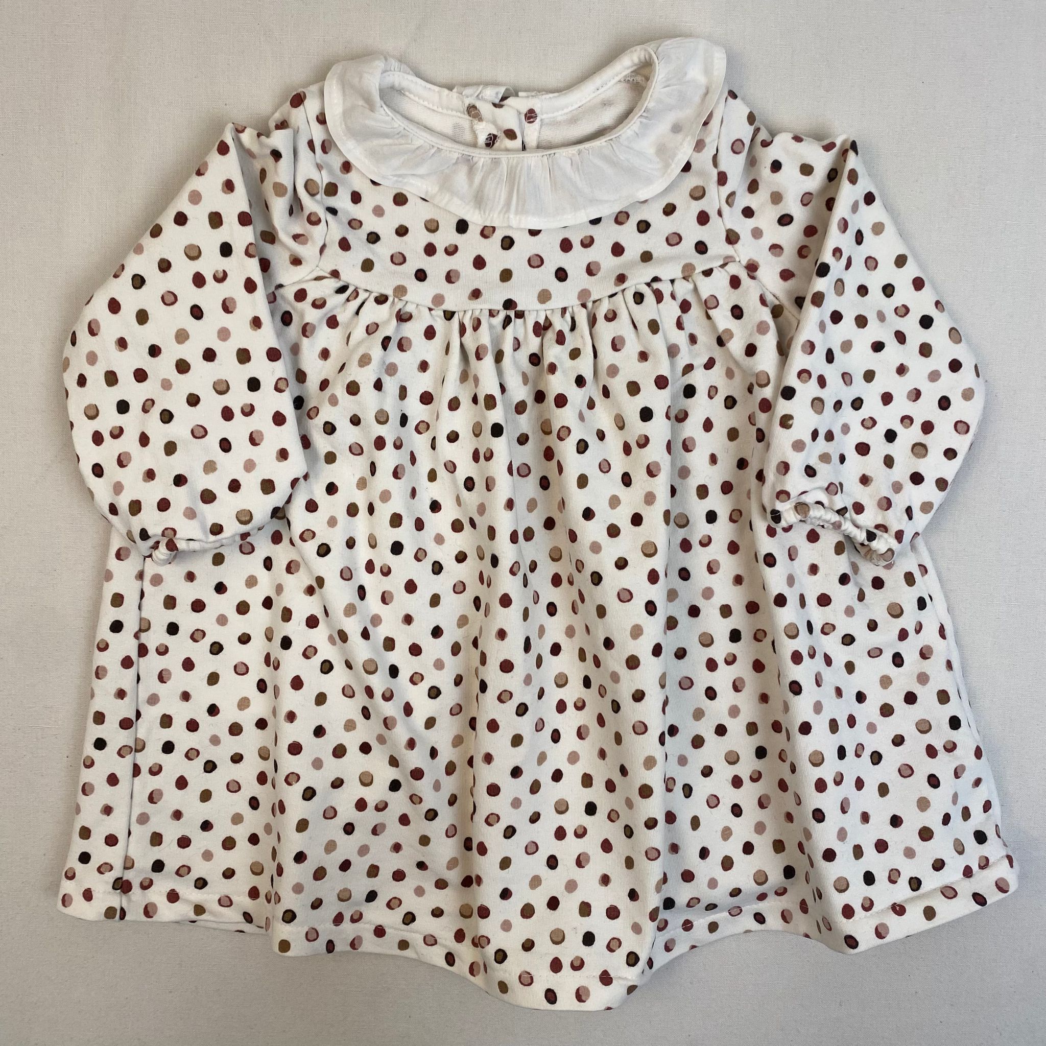 4% elasthanne. Robe à pois marron, manches longues, col collerette, poignets élastiques, fermerure par boutons classiques au dos.