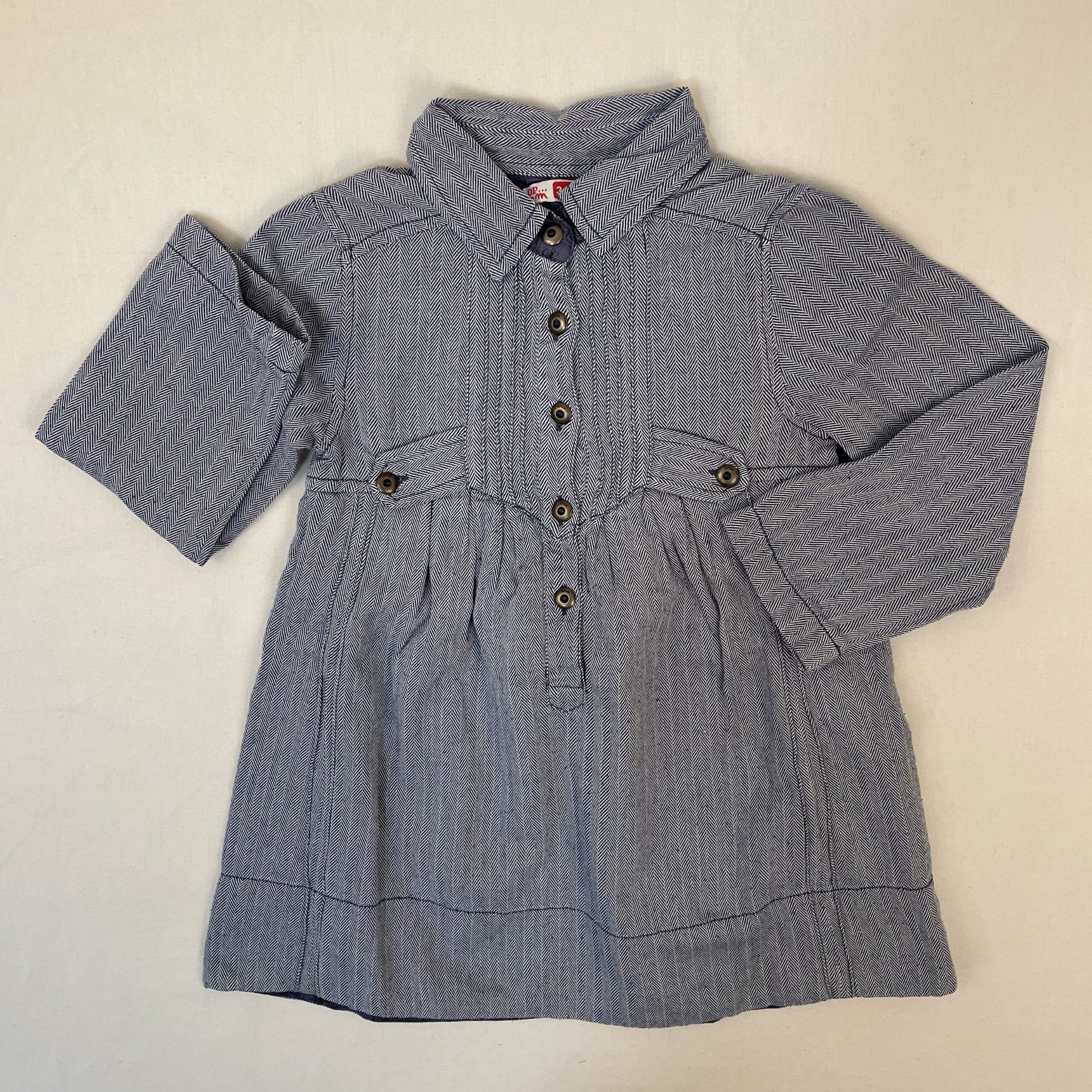 - Robe manches longues à bandes verticales hachurées de bleu, col chemise fermé par boutons classiques devant, froncée à la taille, doublure en coton violet.