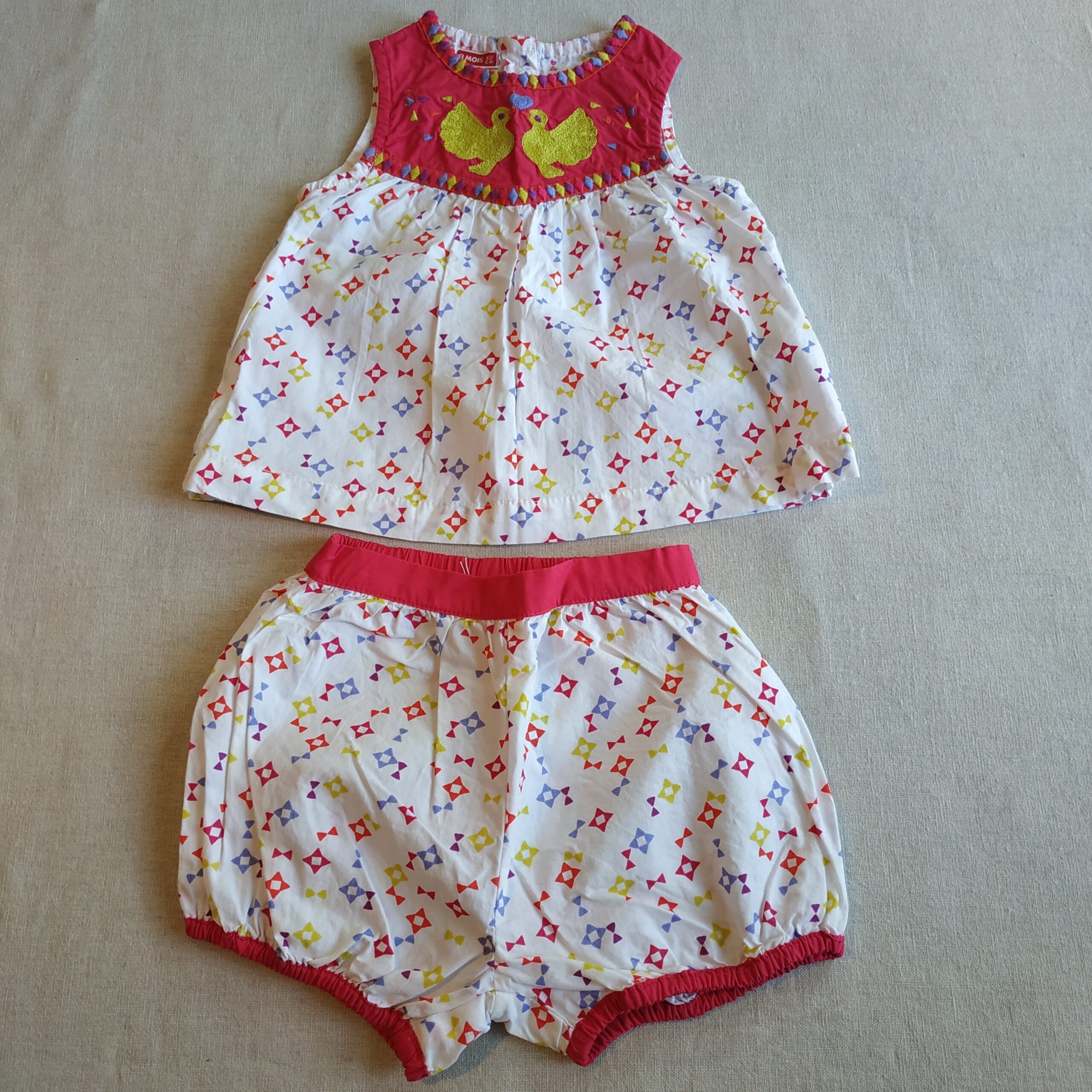 Autres commentaires : Ensemble composé d’une robe sans manches à fond blanc et petits triangles multicolores (rouge, fuchsia, jaune, violet et lavande). Partie supérieure du devant de la robe fuchsia, motifs brodés dont deux colombes symétriques vert anis , arrière s’ouvrant sur toute la hauteur par 5 boutons. Culotte assortie , taille et jambes élastiquées.