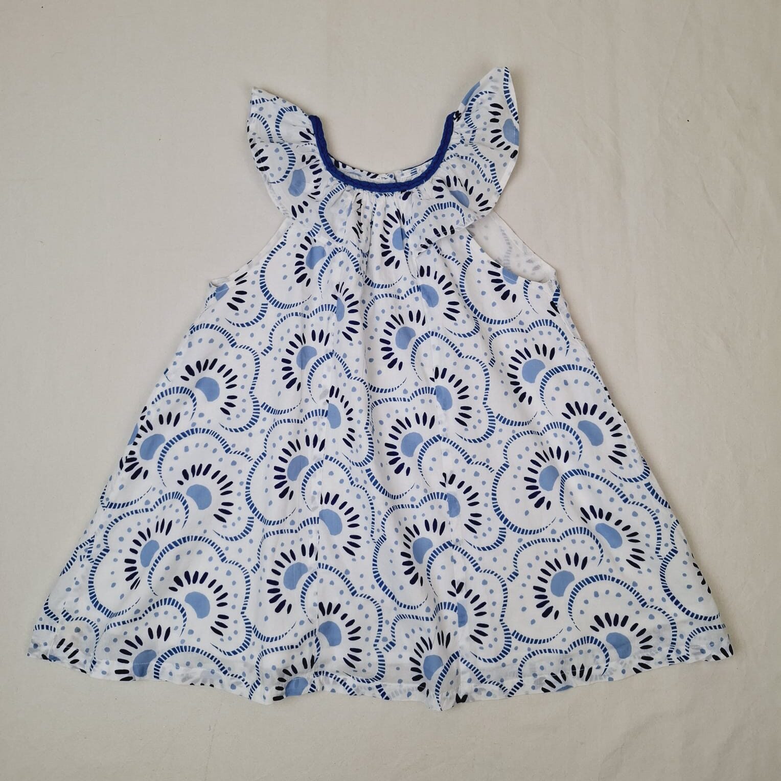Autres commentaires : Robe évasée sans manches blanche, parsemée de fleurs bleues stylisées, encolure arrondie et volantée avec double liseré bleu roi, doublure blanche 100% coton, fermeture au dos par boutons.