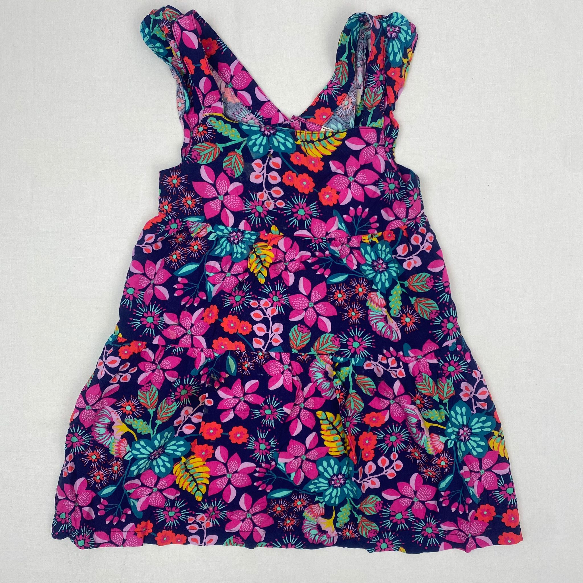 Autres commentaires : Robe rose à fleur sans manches, ouverture au dos par boutons.