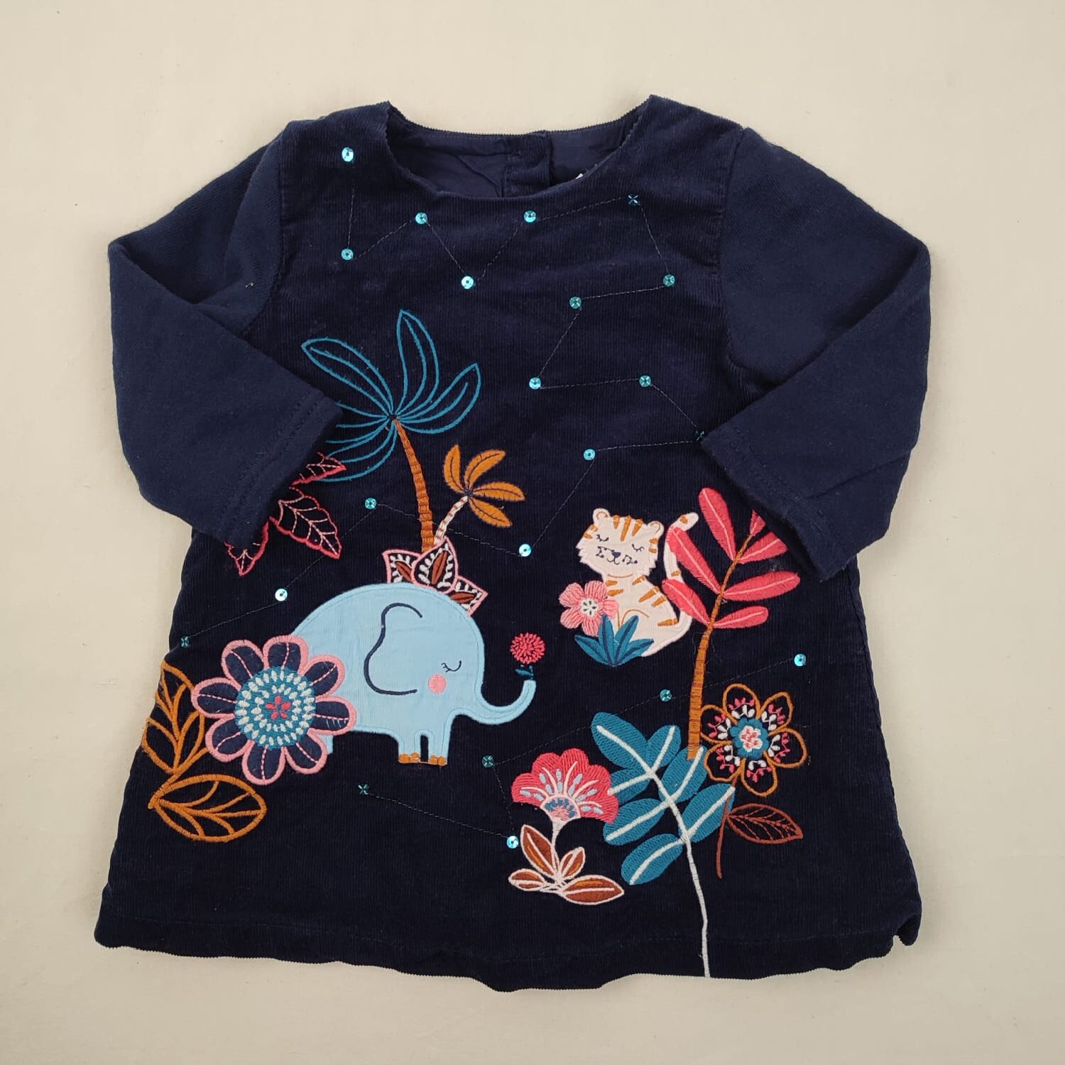 Autres commentaires : Robe manches longues bleu foncé en velours côtelé, forme un peu trapèze, col rond, doublure coton, devant motifs brodés colorés de jungle avec éléphant et tigre, fermeture par boutons au dos.