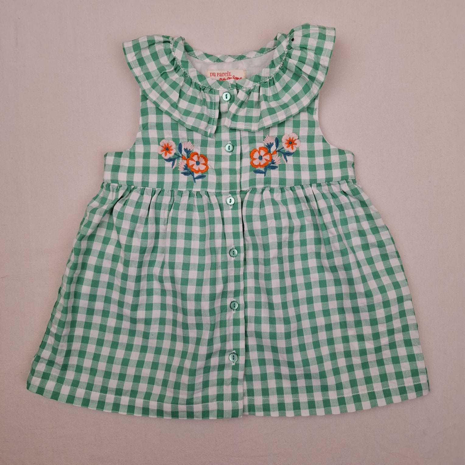 Autres commentaires : Robe à carreaux verts et blancs, sans manches, col à volants et proberies de fleurs sur plastron.