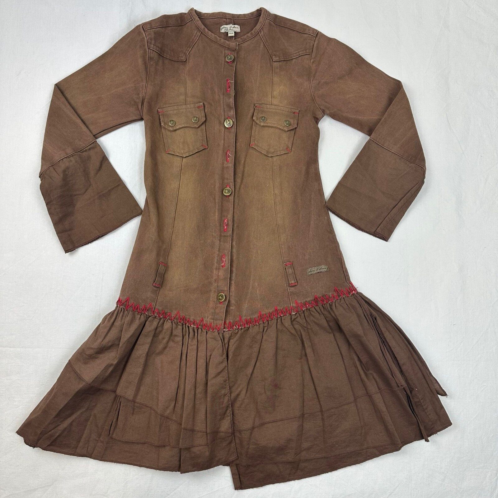 Autres commentaires : Robe marron mznches longues à cloche avec une fermetureoar boutons , 2 poches sur les 2 côtés et le bas en format de jupe.