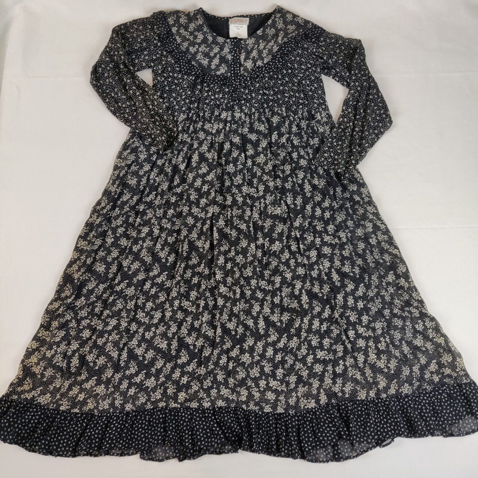 Autres commentaires : Robe doublée à manches longues (Taille L Esprit Kids) – noir avec motifs floraux beiges. Colerette en dessous du col. Ouverture centrale à 5 boutons.