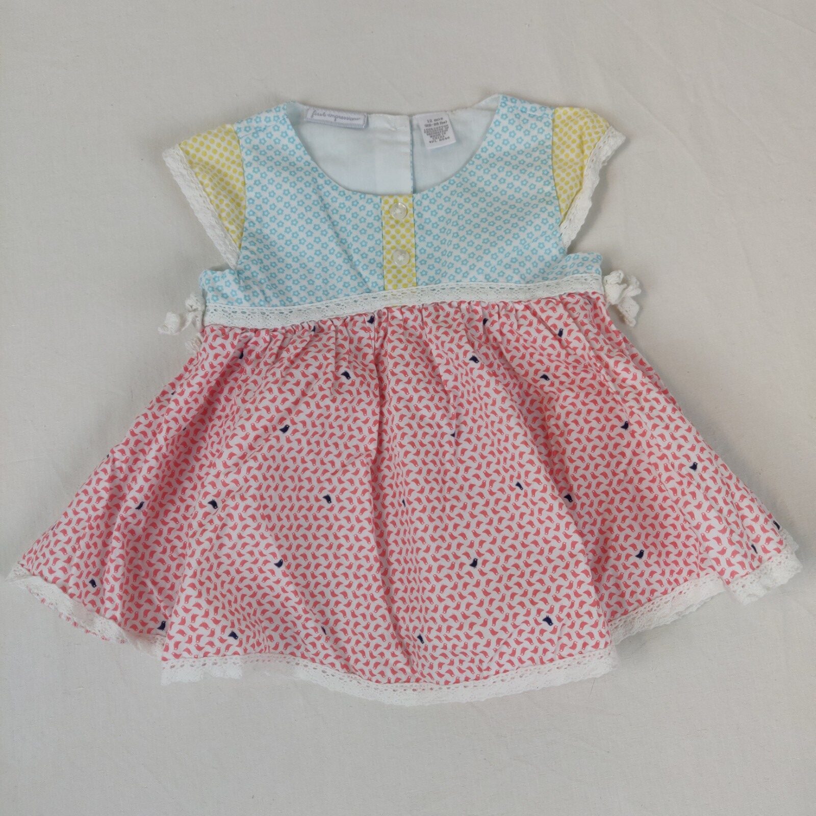 Autres commentaires : Robe à manches courtes – blanc. Partie centrale motifs petites fleurs bleues. Motifs pois jaunes aux manches et au centre. Motifs petits oiseaux rouges et bleu marine au niveau de la jupe. Taille marquée par un ruban en dentelle blanche. Ouverture centrale au dos à 3 boutons.