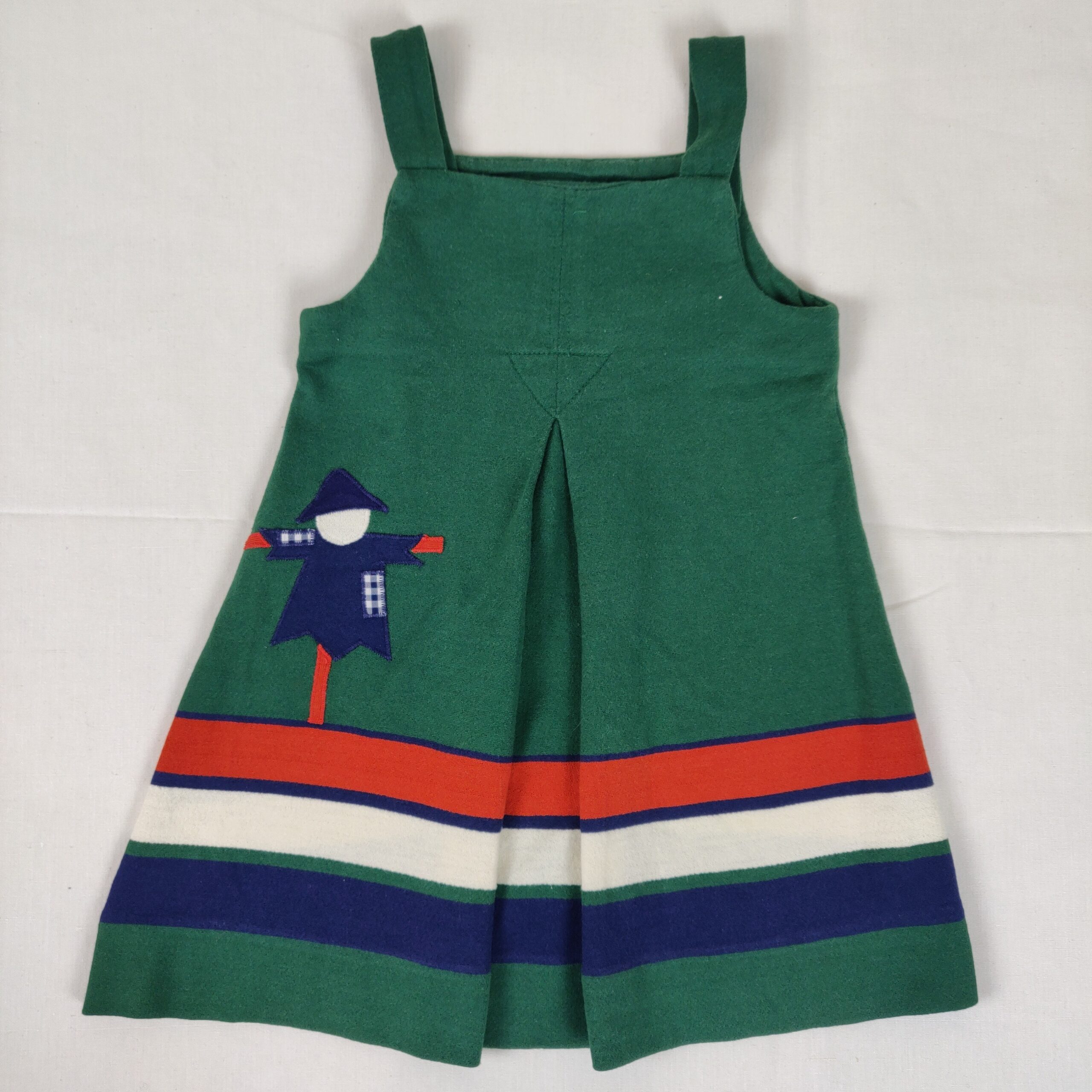 Autres commentaires : Robe vert sapin avec 3 bandes de couleur rouge blanc et bleu foncé de type chasuble avec bretelles fermées par bouton en haut du dos – motif épouvantail.