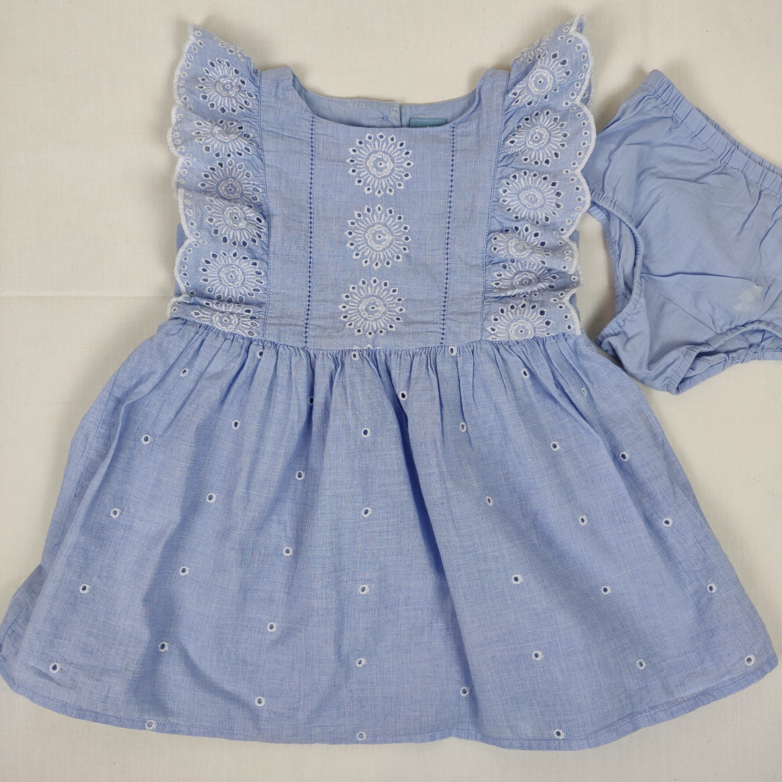 Autres commentaires : Robe bleue en coton bleu, broderies blanches et volants sur plastron, doublure en coton bleu, fermeture par boutons au dos. Culotte assortie.