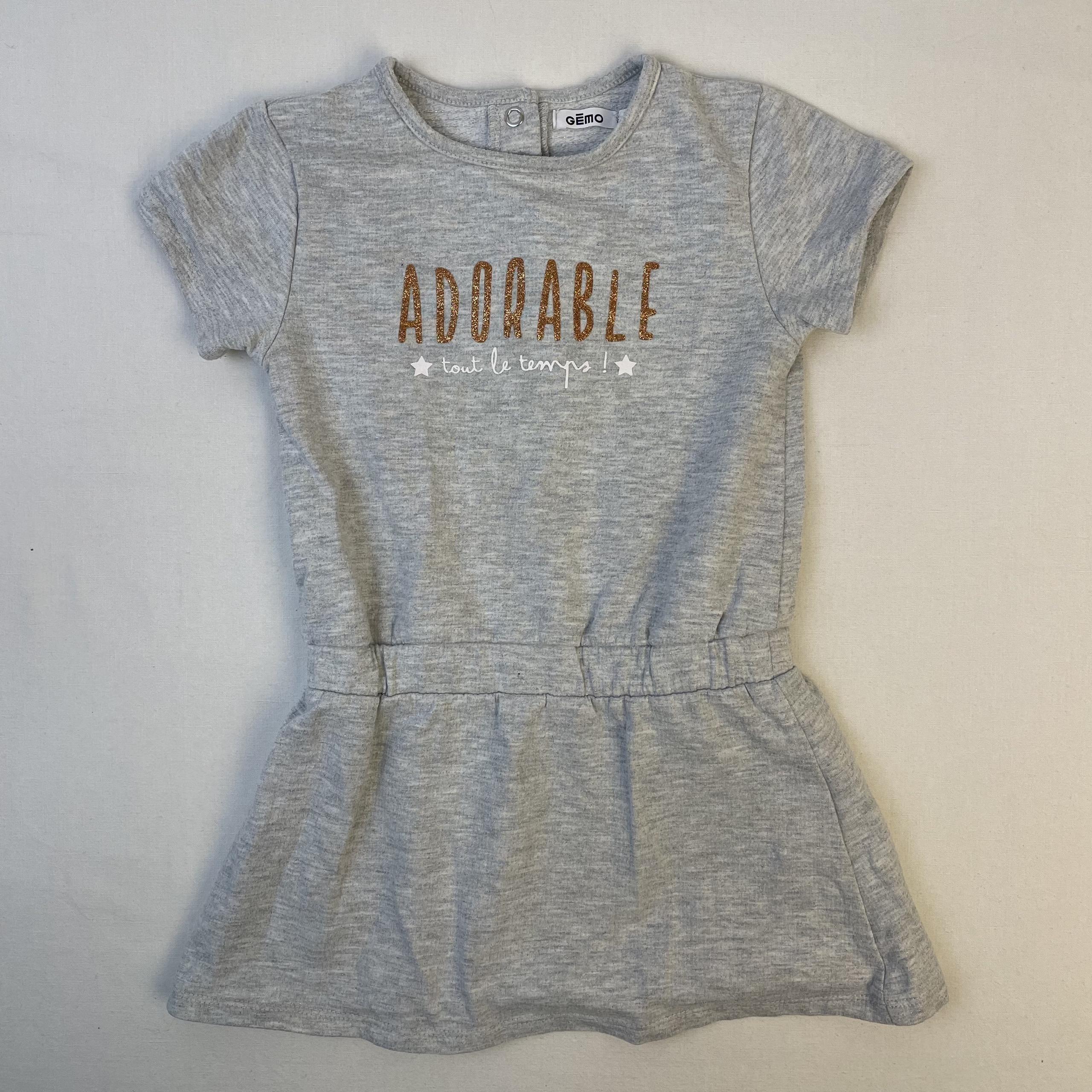 - Robe gris clair à manches longues, effet pailleté léger, devant inscription « ADORABLE » en doré, fermeture au dos par boutons pression.