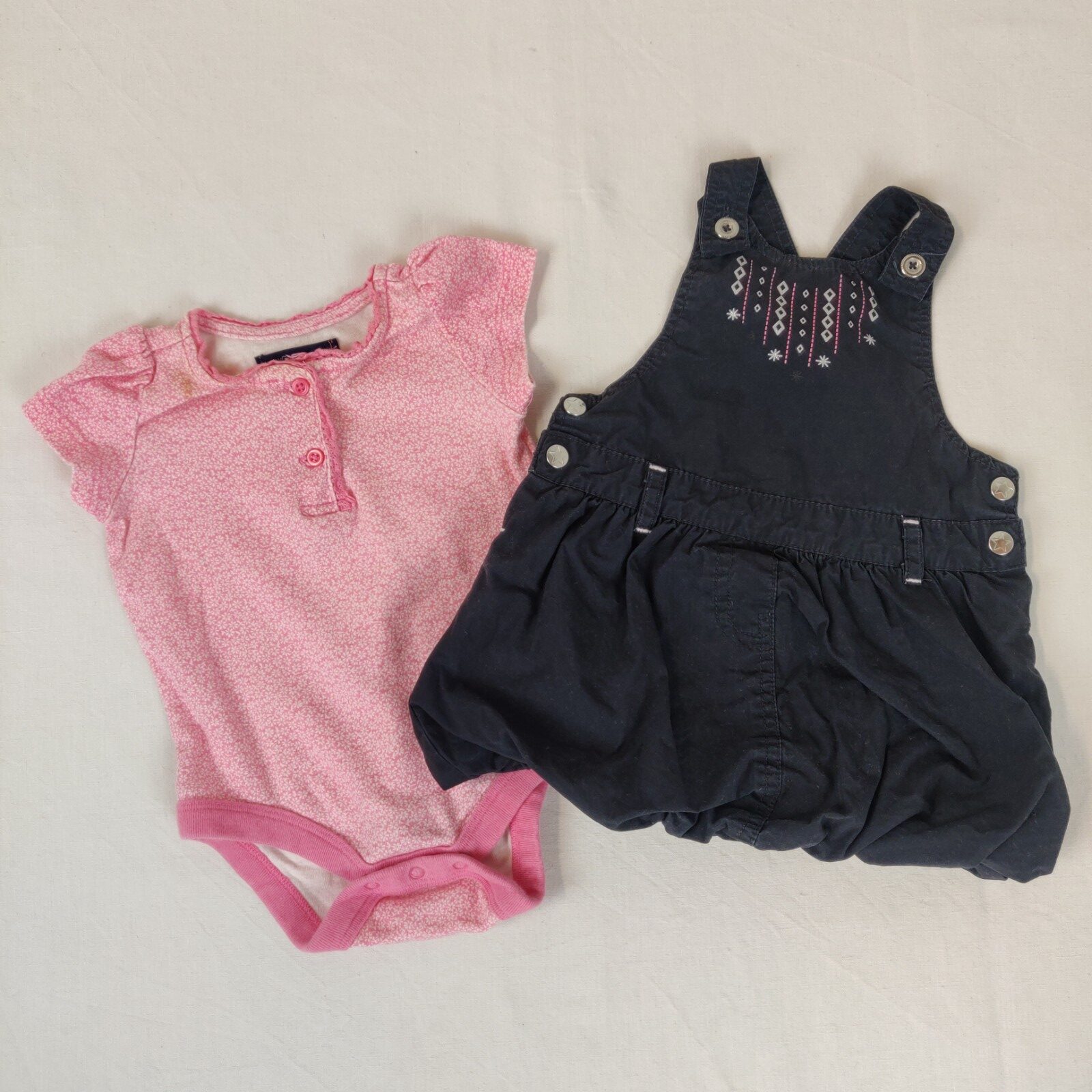 Autres commentaires : Robe boule plissée à bretelles- noir. Motifs centraux géométriques roses, noirs et argentés. Un body à manches courtes Gap rose à fins motifs floraux blancs offert. Tâche marronée près du col.