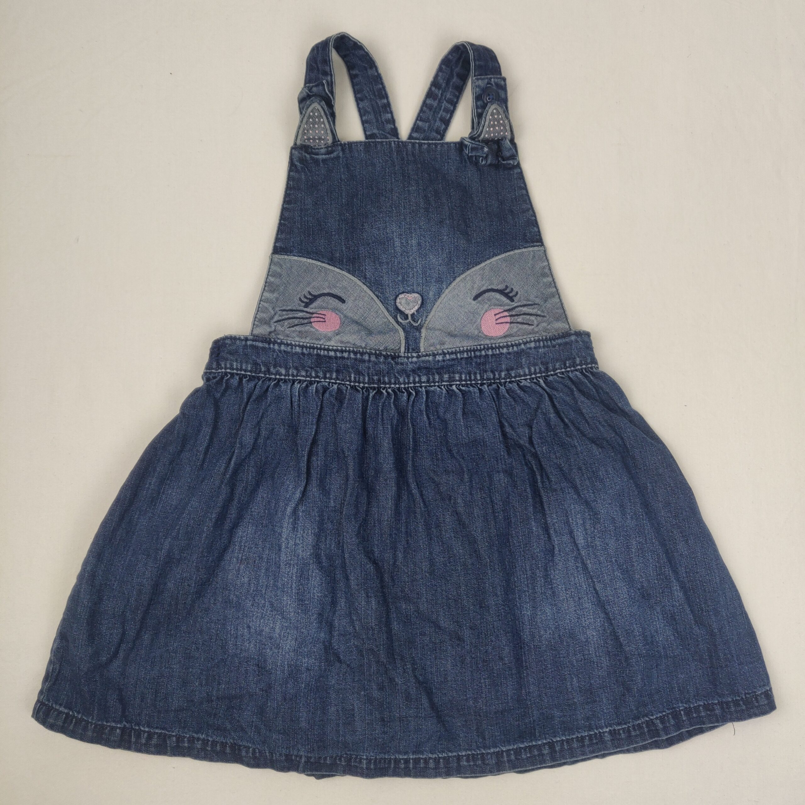Autres commentaires : Robe saloppette en denim bleu, hauteur des bretellescroisées dans le dos, réglable par 2 boutons, taille semi-élastiquée, jupe plissée, motif tête de lapin sur la haut doublé de tissu bleu marine avec étoiles blanches.