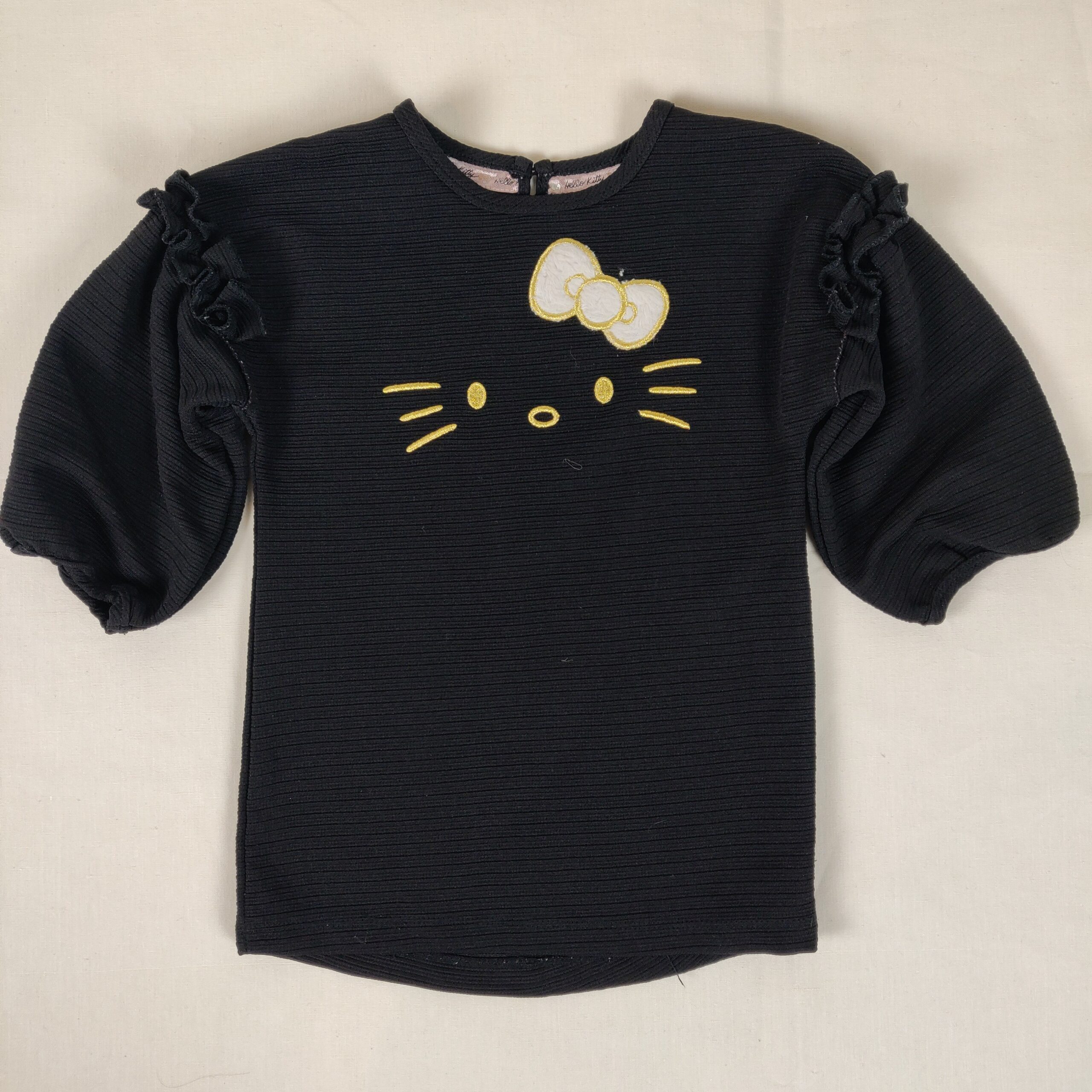 Autres commentaires : 3% élastanne – Robe droite à manches longues, noire avec motif Hello kitty doré et blanc sur le devant, ouveture par 1 bouton classique en haut du dos, volants décoratifs noirs au niveau des épaulettes.