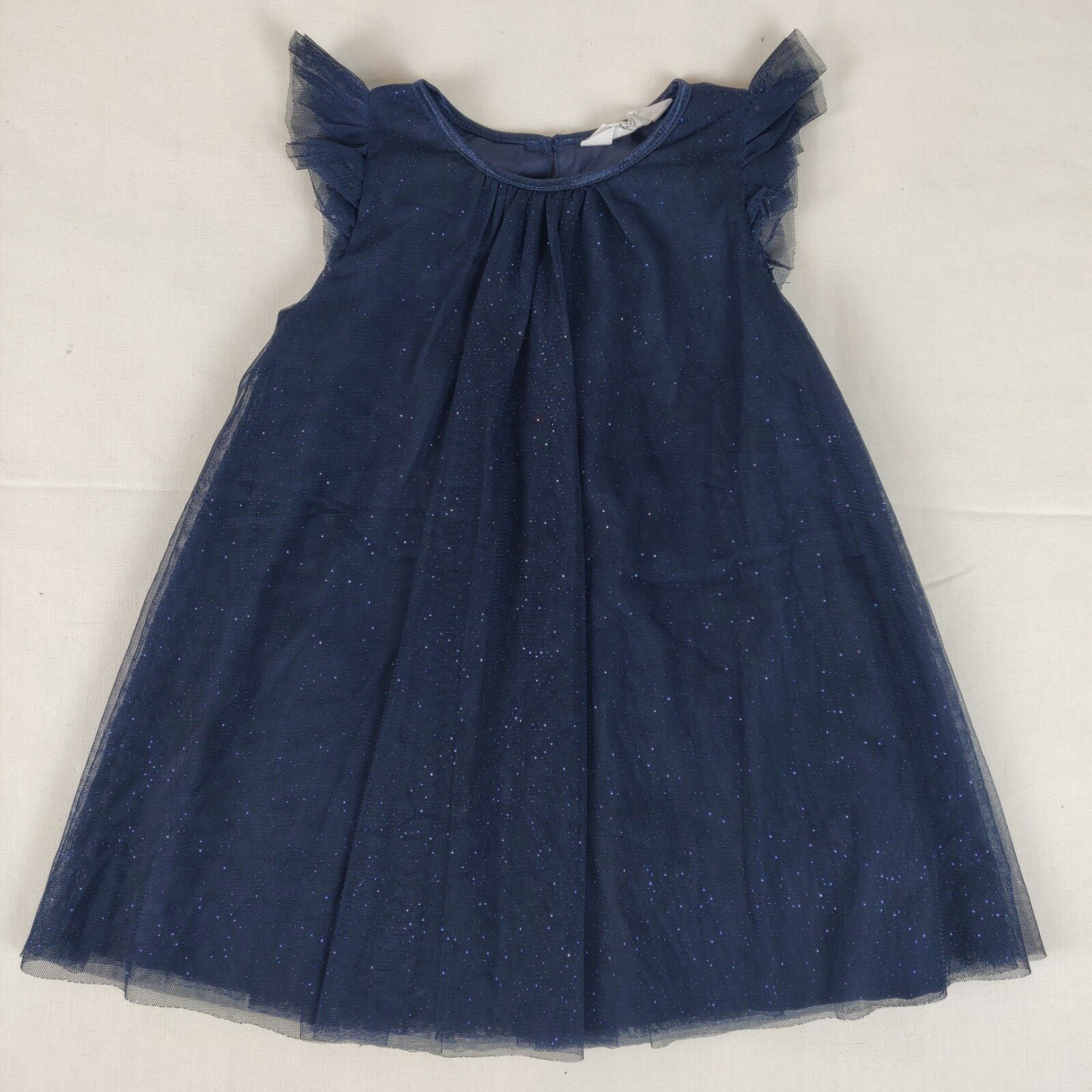Autres commentaires : Robe – bleu nuit – à manches très courtes froncées en tulle pailleté bleu. Doublure – bleu nuit. Petite échancrure dans le haut du dos se fermant par un bouton nacré.