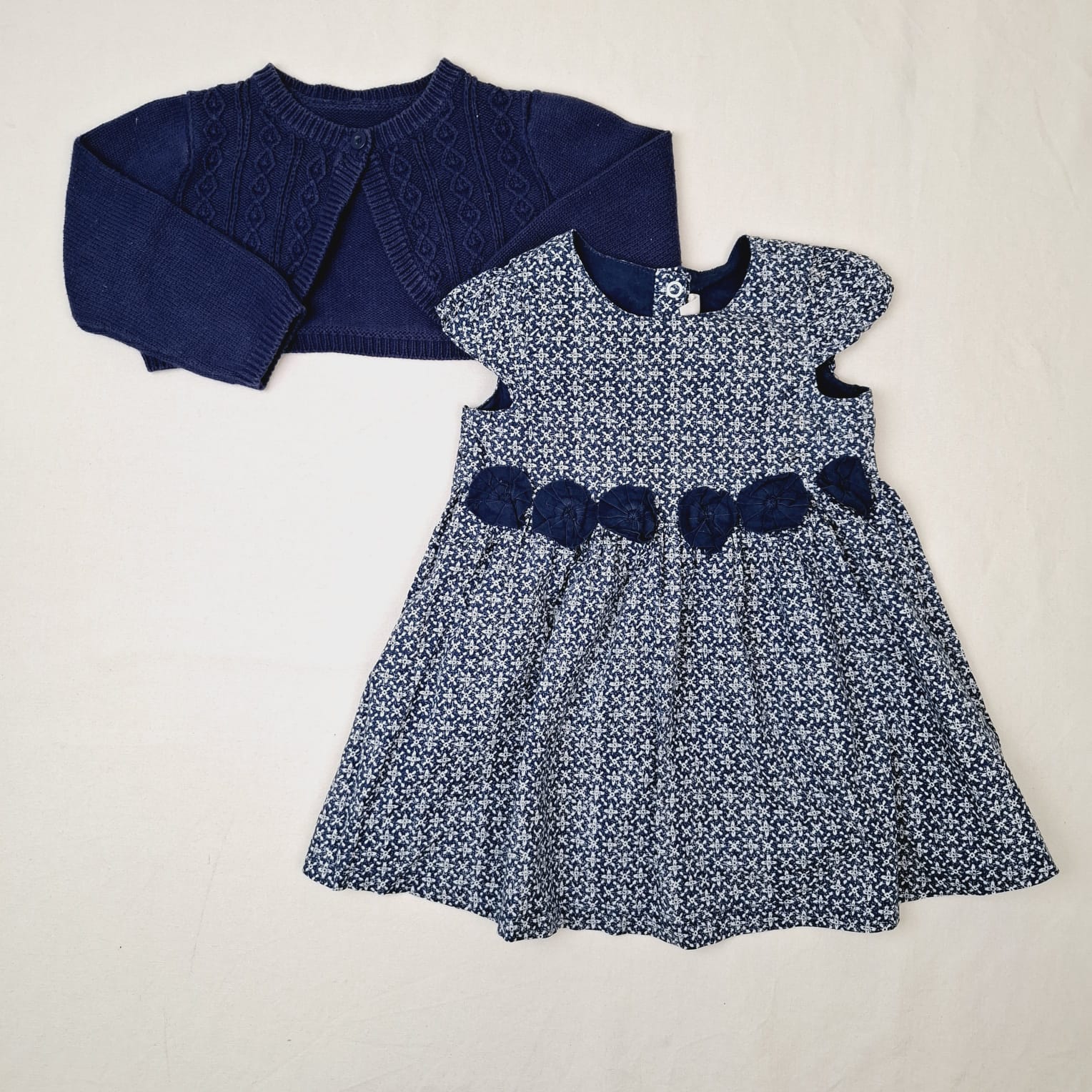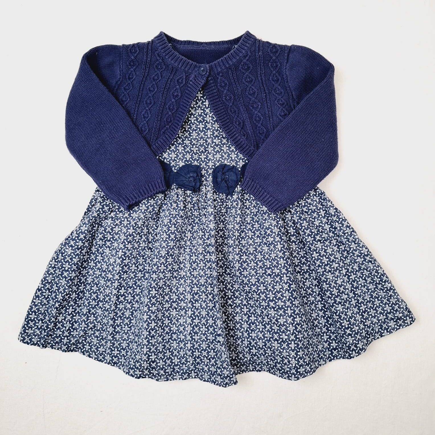 Autres commentaires : Ensemble 2 pièces : – Robe bleu marine à imprimé blanc à manches courtes, col rond, fermeture par boutons pression, fleurs en tissu sur le devant. – Boléro Mothercare tricoté bleu foncé, fermeture par boutondevant, finition bord-côte autour de le col, à la base et en bas de manche.