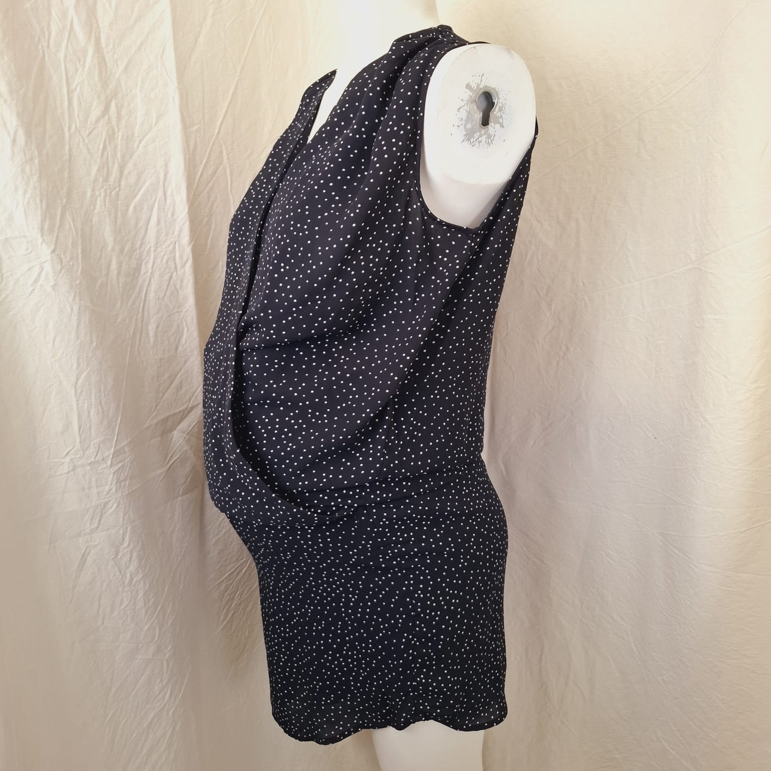 Autres commentaires : Robe de grossesse noire à pois blancs sans manches, col V, taille XS, doublure 100% polyester.