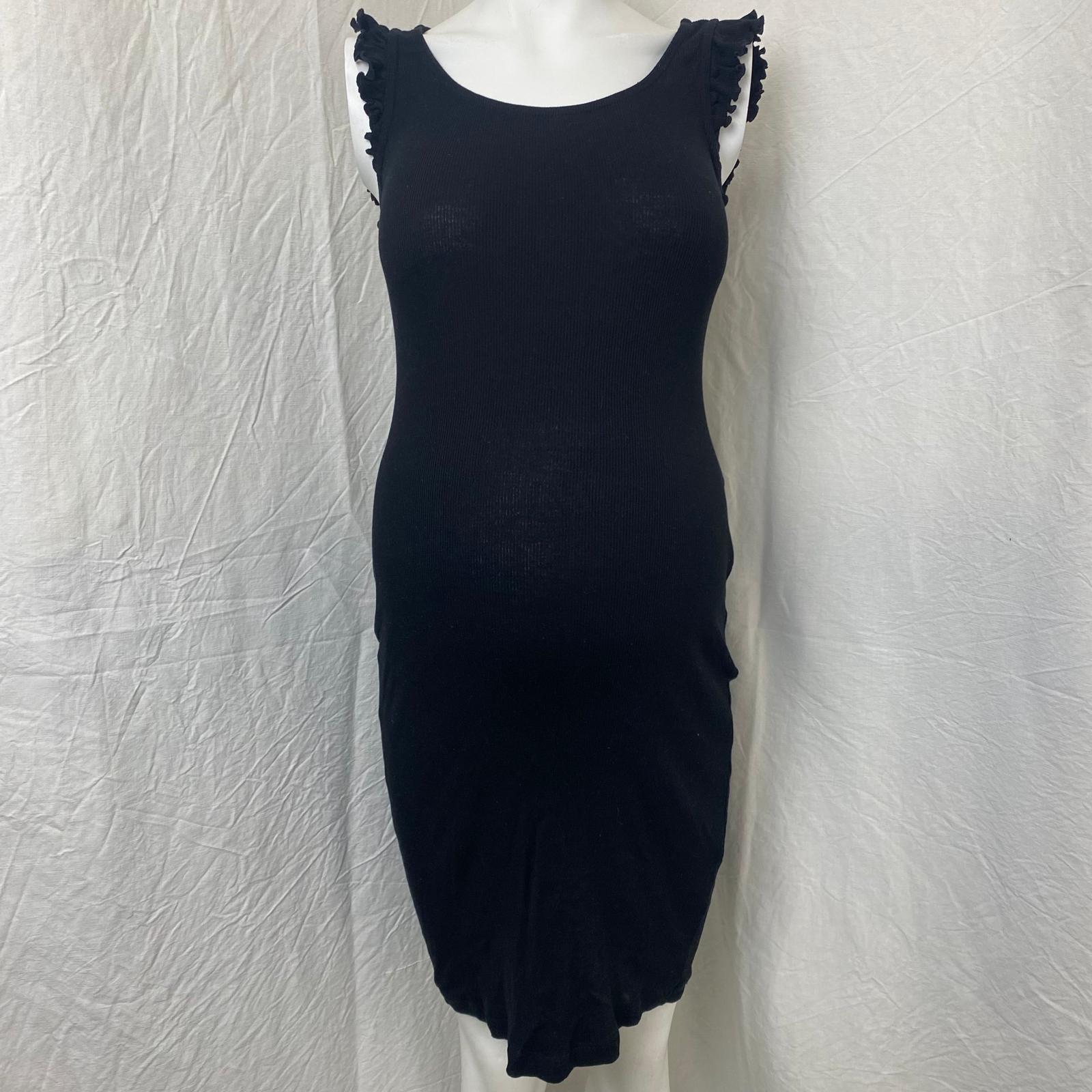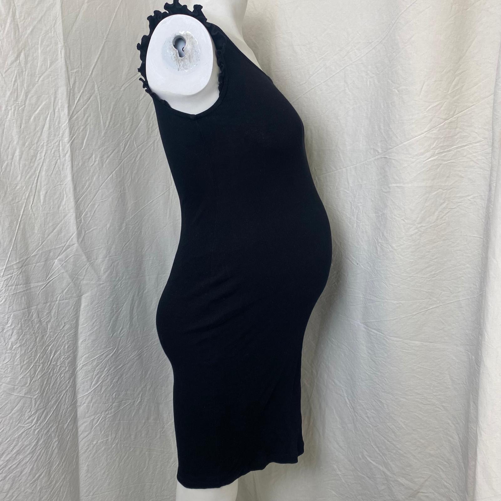 Autres commentaires : Robe maternité droite et longue, sans manches, en tissu noir côtelé et élastiqué, volantée aux épaules. Taille S (large).