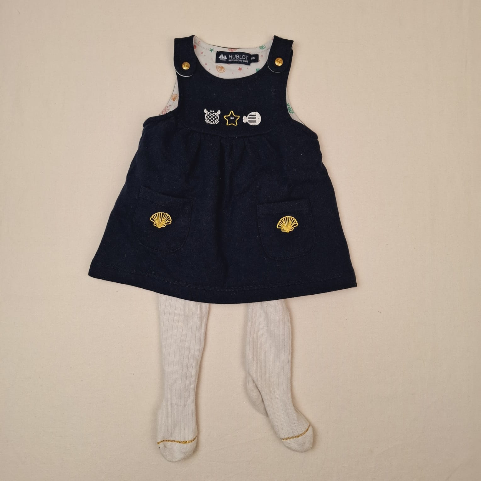 Autres commentaires : 50% polyester. Robe marine en molleton à bretelles, fermeture par boutons pression sur les épaules, deux poches devant avec motif coquillages dorés broderie. Collant blanc DPAM offert.