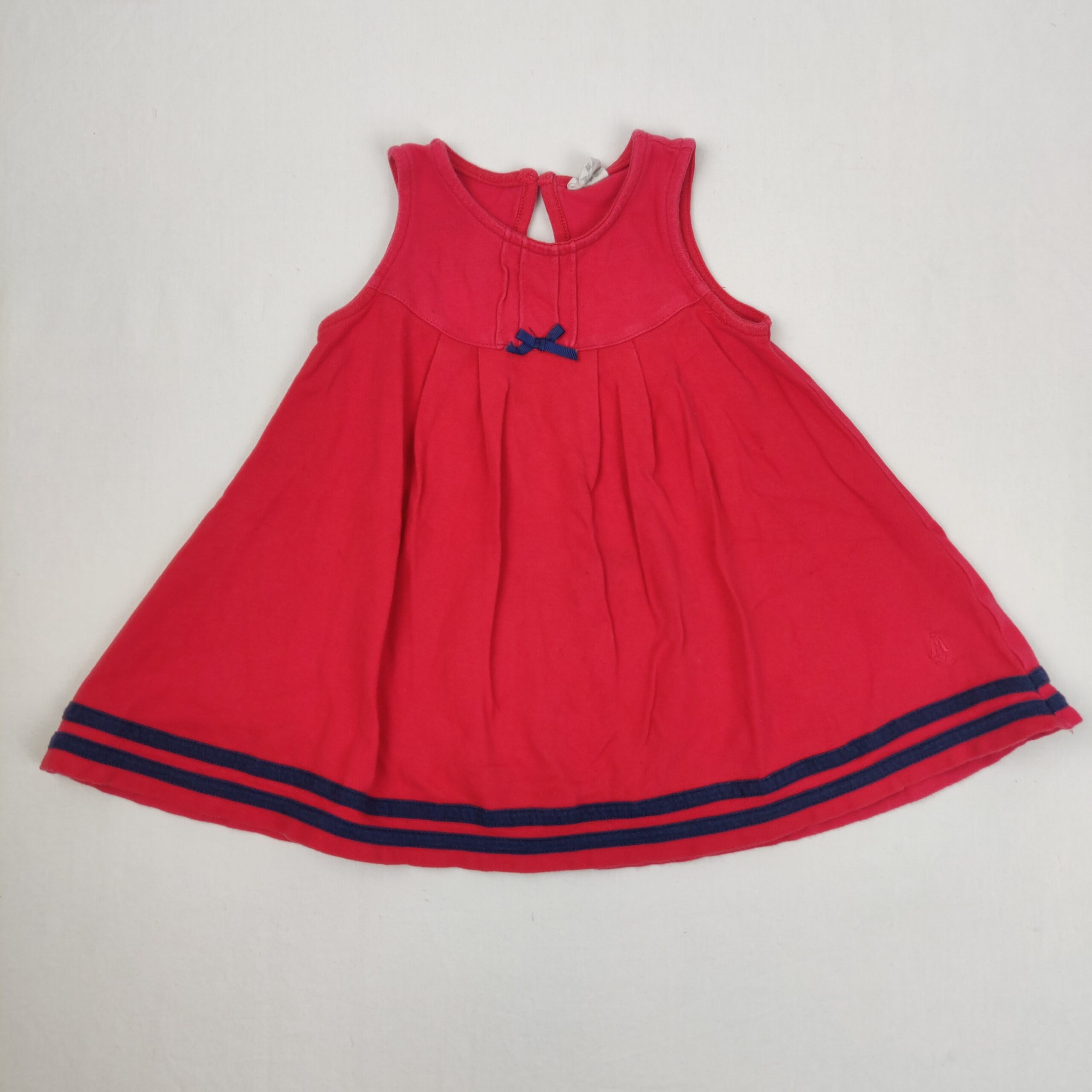 Autres commentaires : Robe sans manches, col rond, noeud et liserés bleu marines, fermeture par bouton à dos.