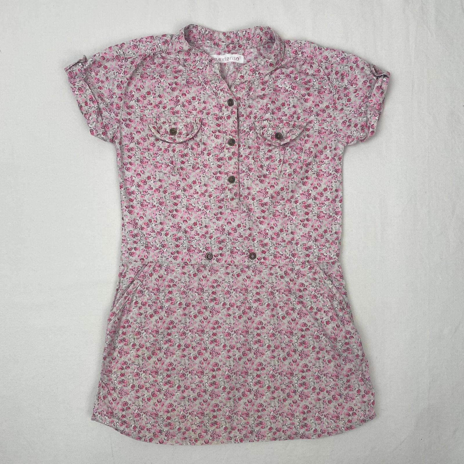 Autres commentaires : Robe un peu trapèze, manches courtes à revers, imprimé gris à petites fleurs roses et blanches fermeture devant et des poches par boutons, taille basse.
