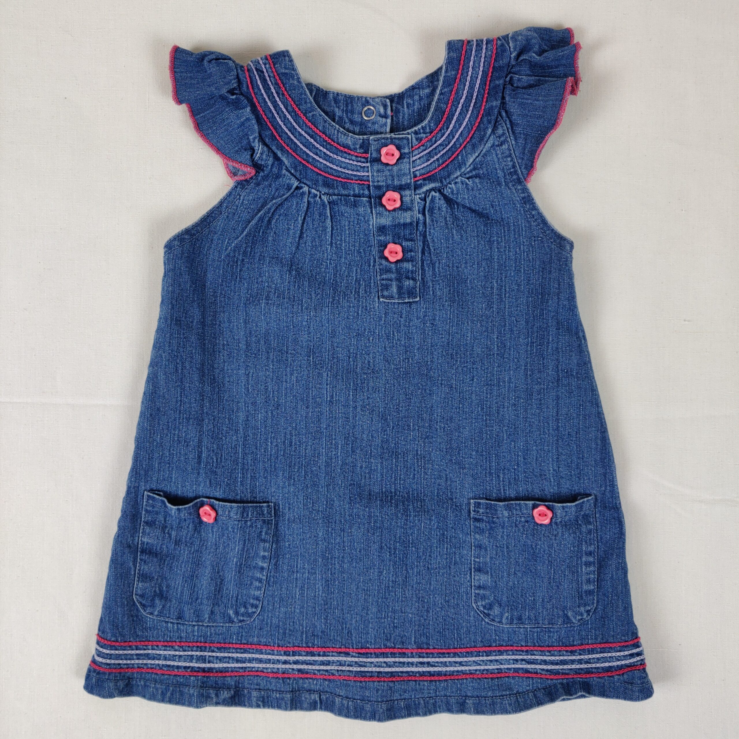 Autres commentaires : 23% polyester, 1% Elathanne. Robe en denim manches à volants, coutures roses fuchsia et violette, boutons en forme de fleurs ross, deux poches plaquées à l’avant. Ceinture ajustable (taille assez étroite). Fermeture par boutons pression à l’arrière.