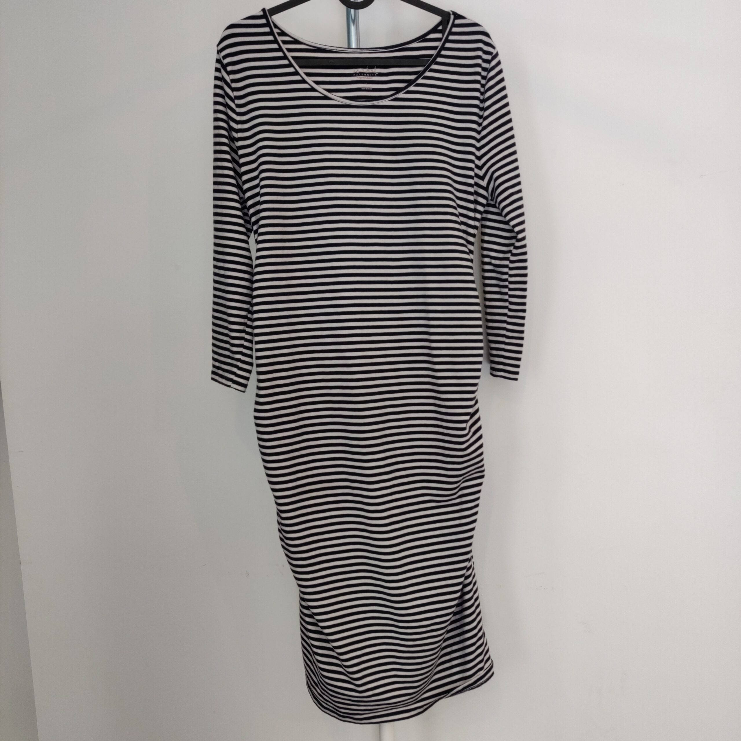Autres commentaires : Robe marinière bleu très foncé et blanche à manches 3/4, taille froncée sur les côtés – couture un peu défaite en bas derrière