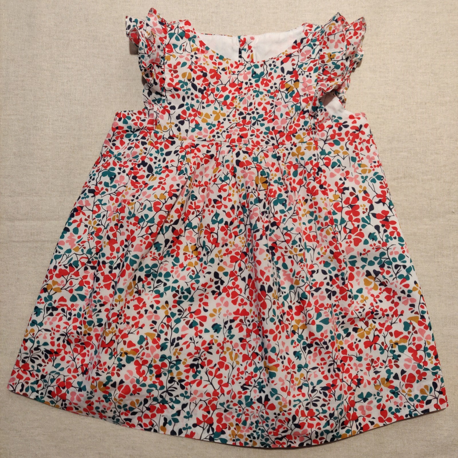 Autres commentaires : Robe à manches très courtes volantées, taille haute suivie de plis. Fermeture par boutons le long du dos. Motif de branches fleuries rouges, vert bouteille, roses, bleu marines et moutarde. En parfait état.