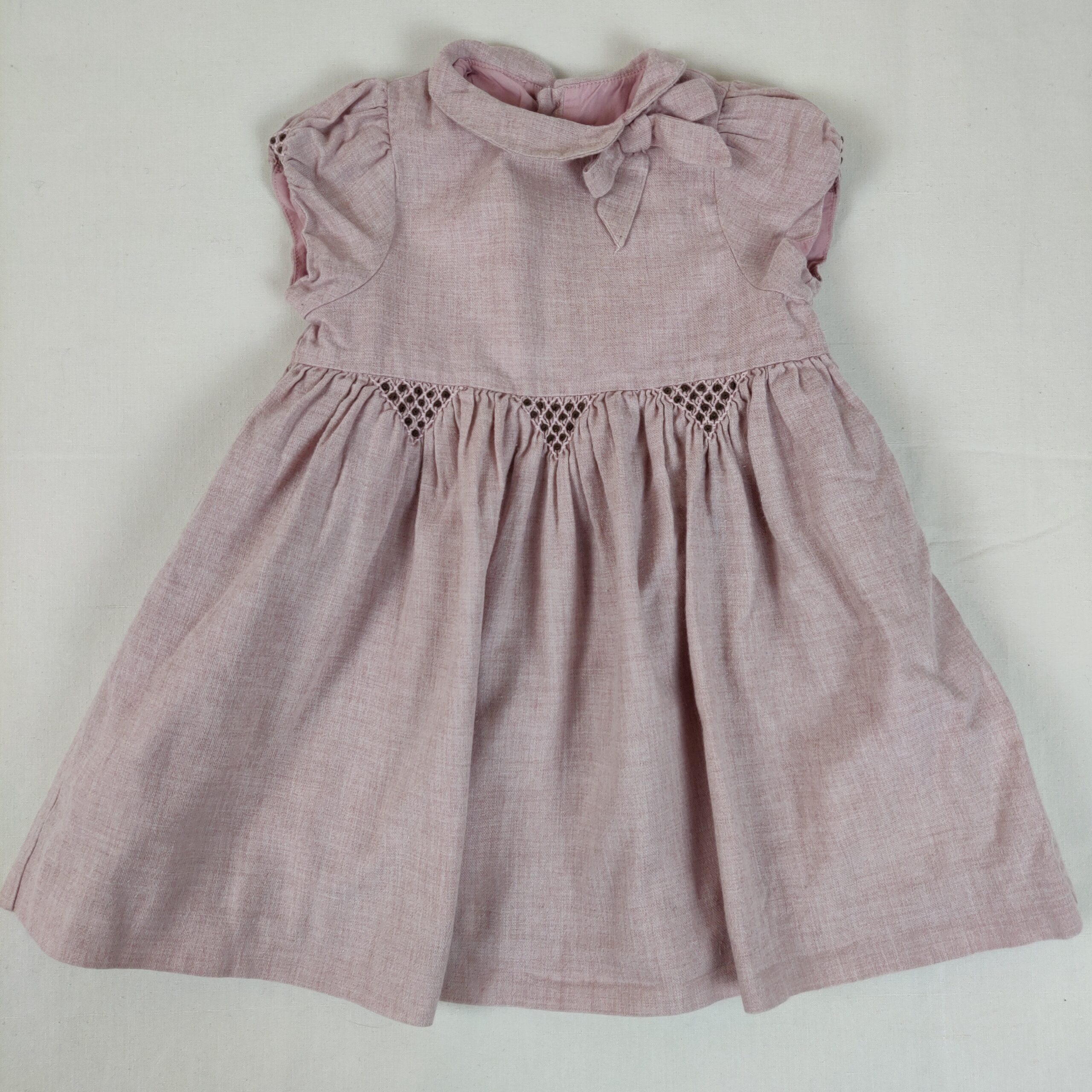 Autres commentaires : 20% laine. Robe doublée à manches courtes – rose chiné avec des broderires triangulaires à la taille. Col claudine avec un noeud décoratif. Ouverture centrale tout le long du dos à boutons classiques nacrés.