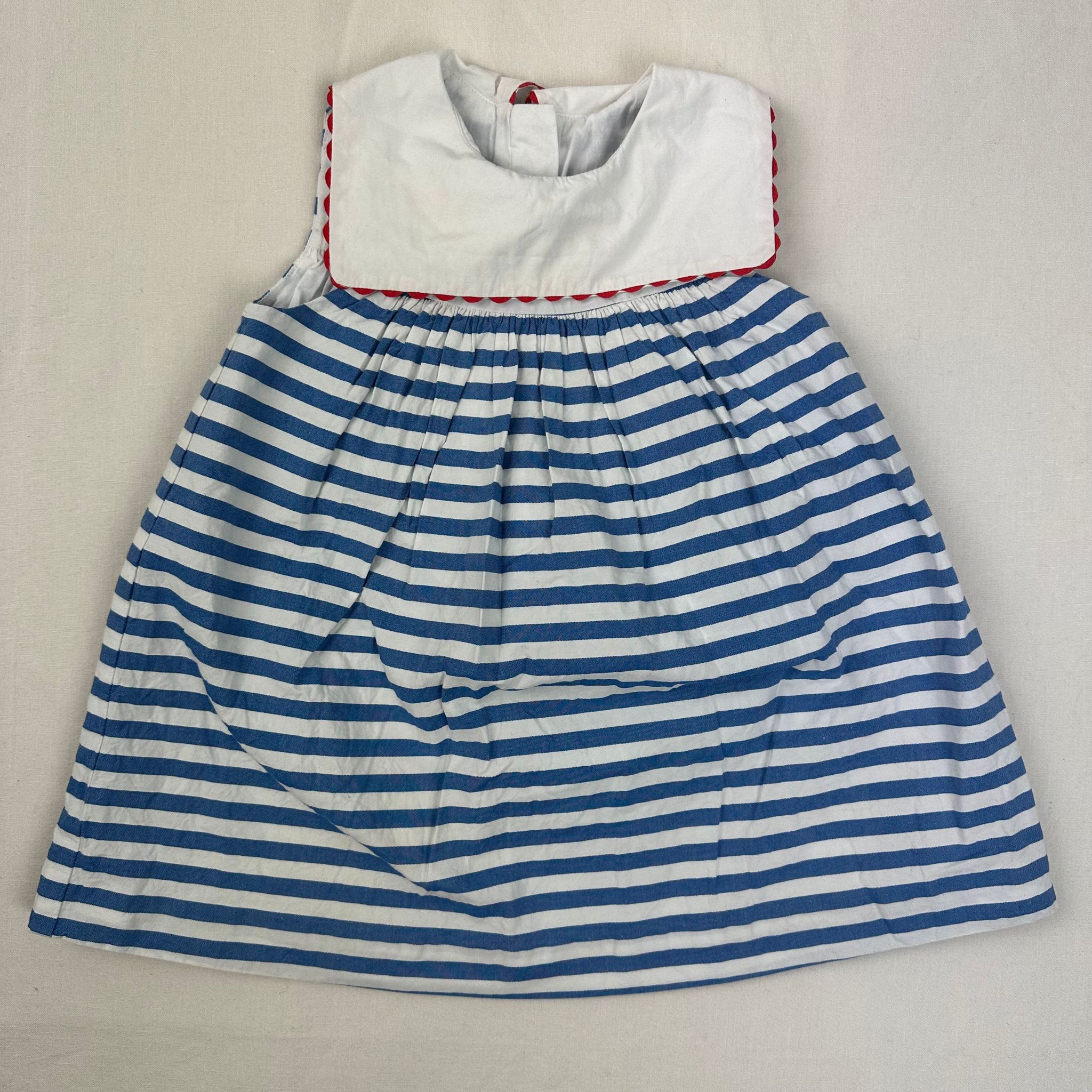 Autres commentaires : Robe bleu avec rayures blanches, col carré avec doublure et une fermeture au dos en zip.
