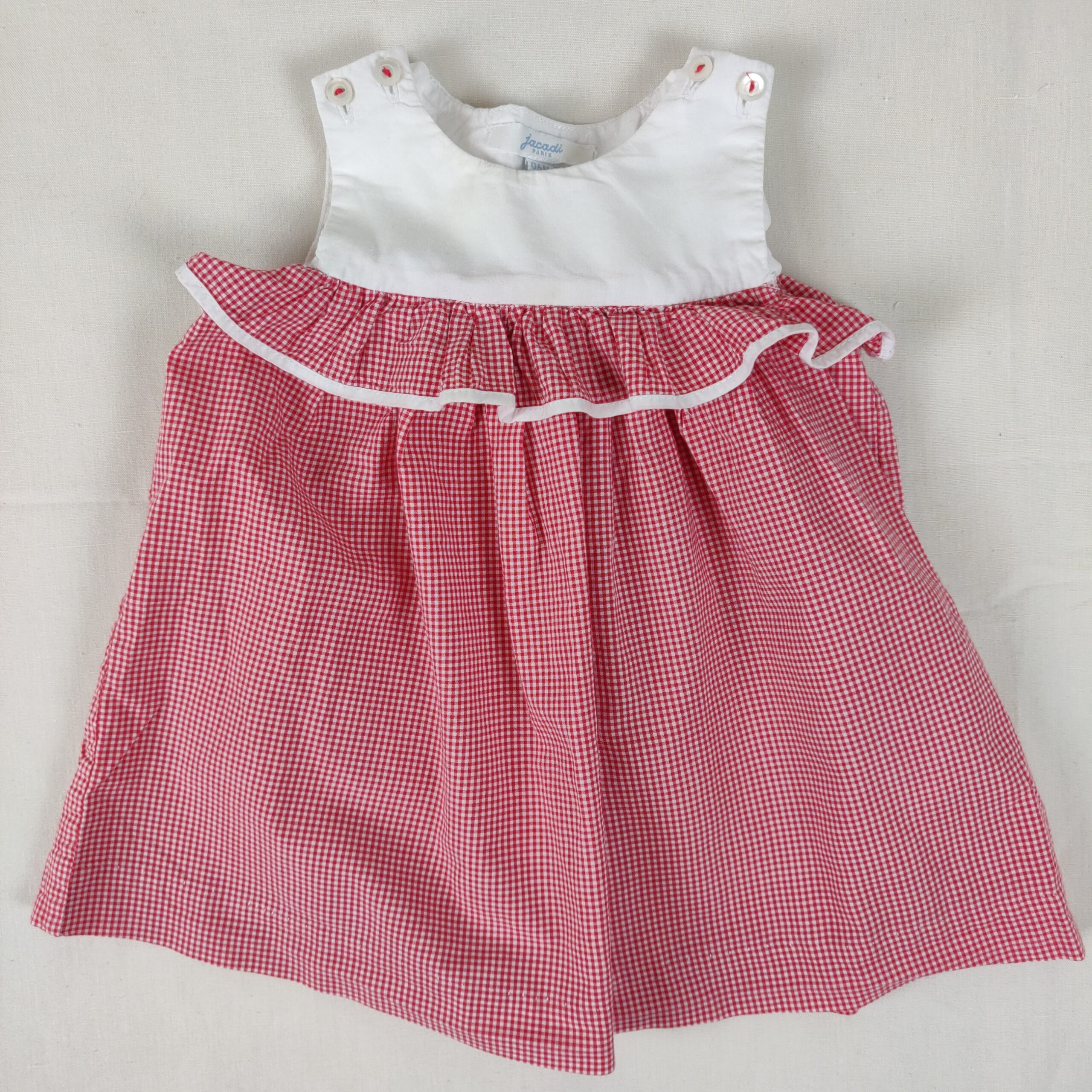 Autres commentaires : Robe sans manches, haut blanc à col rond et bretelles fermées par 2 boutons chacune, jupe en vichy blanc et rouge, volant à la taille.