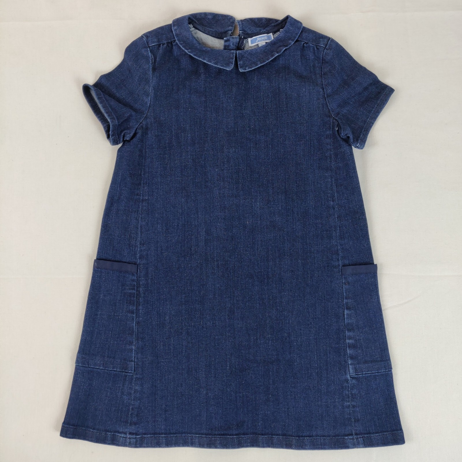 Autres commentaires : 2% élasthanne. Robe à manches courtes en denim – bleu foncé. Col claudine en denim également. 2 poches latérales. Fermeture centrale au dos zippée.