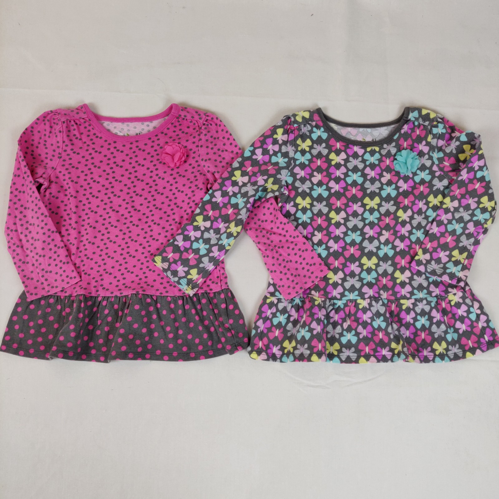 Autres commentaires : Lot de 2 robes à manches longues. Un robe marron glacé avec des motifs multicolores papillons. Fleur centrale en tissu bleu turquoise. Couleurs un peu passées et léger effet pelucheux. Une robe rose à pois gris et l’inverse sur la partie jupe. Fleur centrale en tissu rose. Léger effet pelucheux.