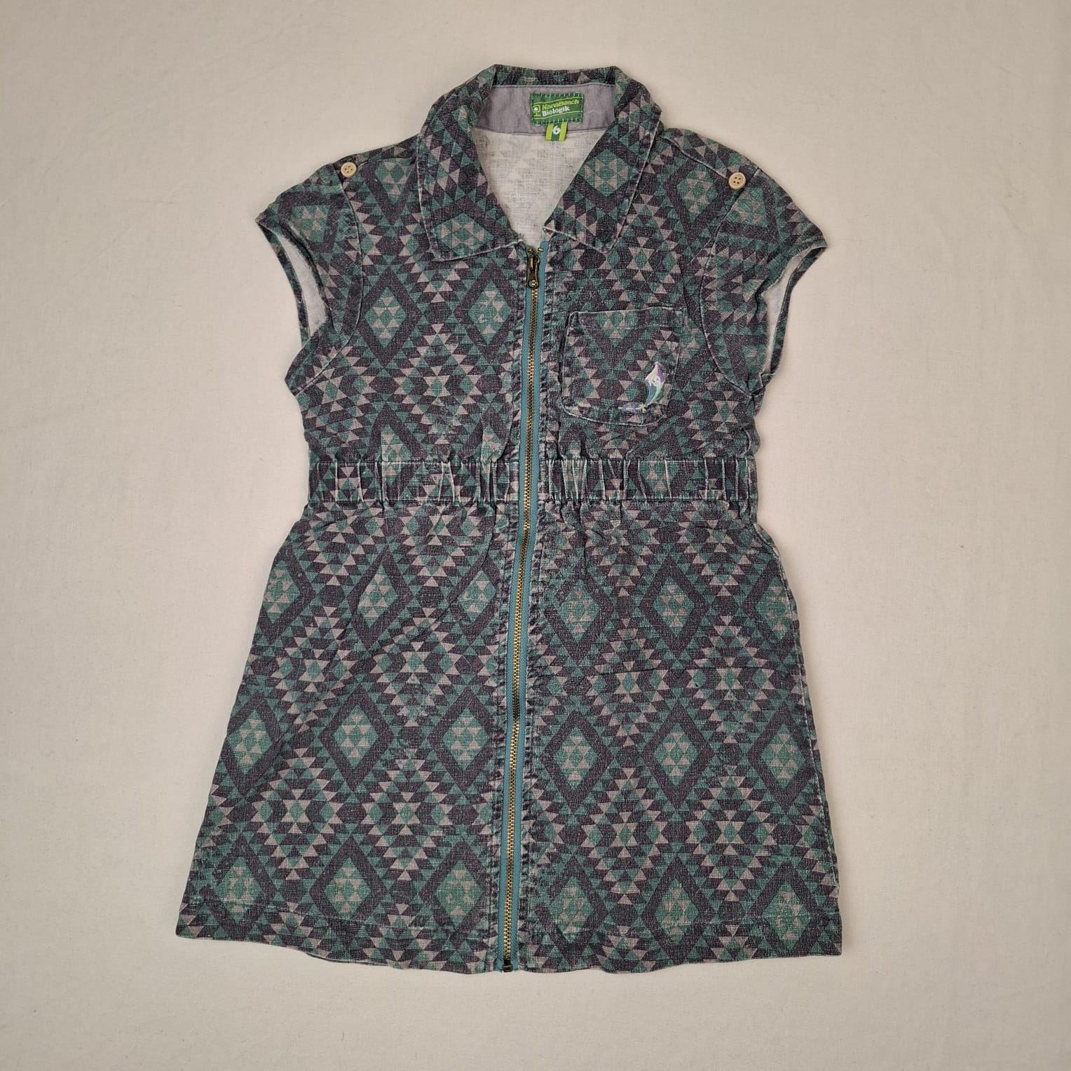 Autres commentaires : 43% coton et 2% élasthanne. Robe à manches très courtes en toile motifs losanges verts et violets, fermeture complète devant par zip, col chemise, taille élastiquée.