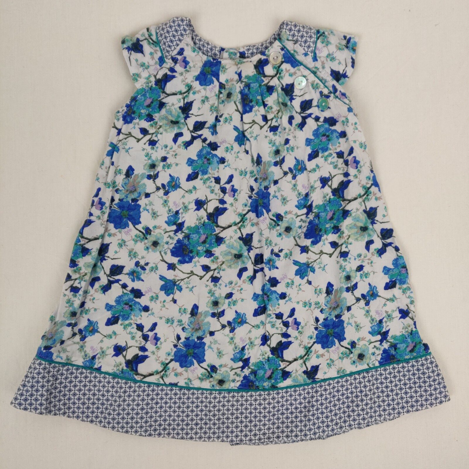 Autres commentaires : Robe manches courtes mi-longue bleu fleuri avec une fermeture au dos par boutons.