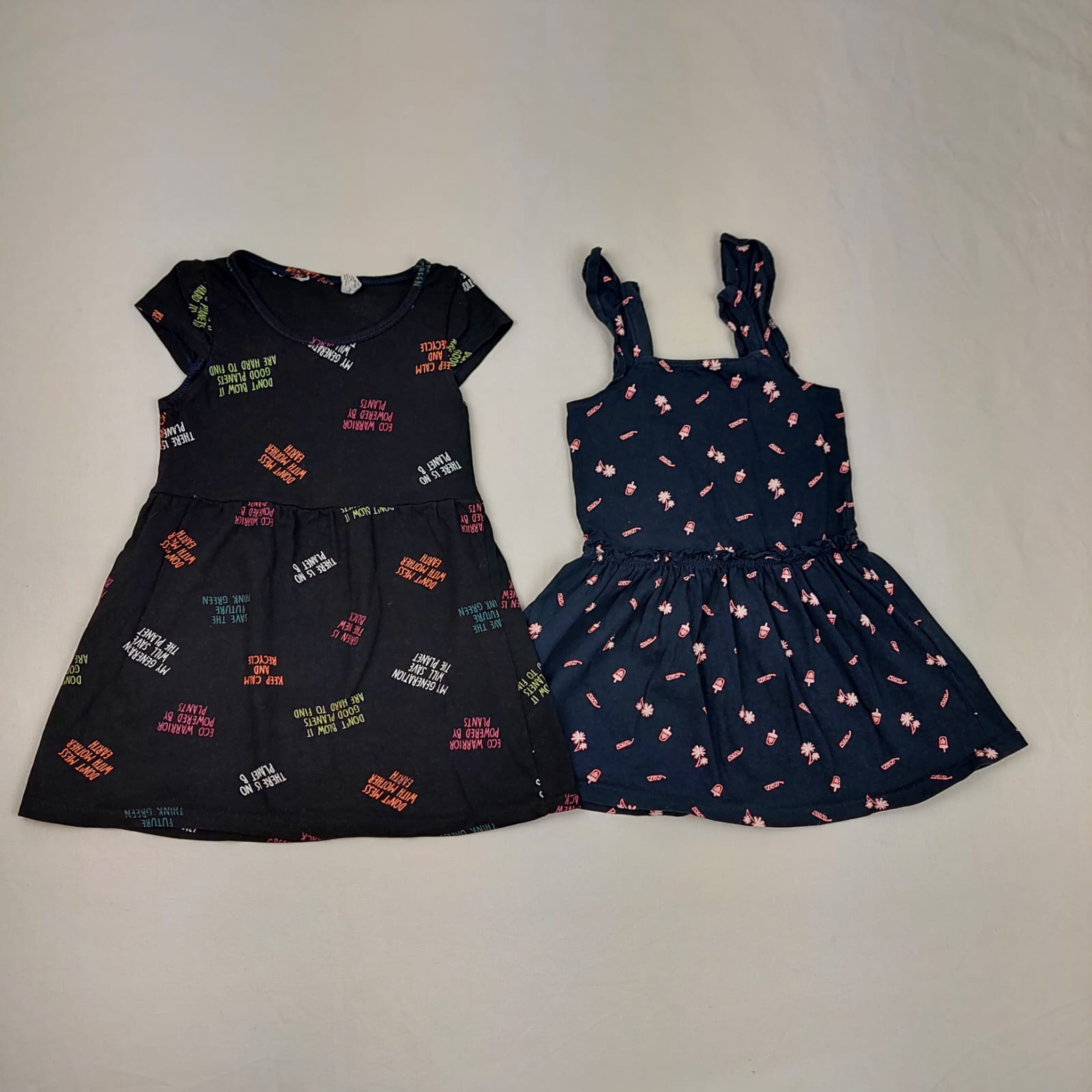 Autres commentaires : Robe Kiabi bleu marine à bretelles volantées et motifs lunettes, gobelets et palmiers roses – Robe sans marque noire à manches courtes, et motifs multicolores pro environnementaux tels que « there is no planet B » ou « my generation will save the planet »
