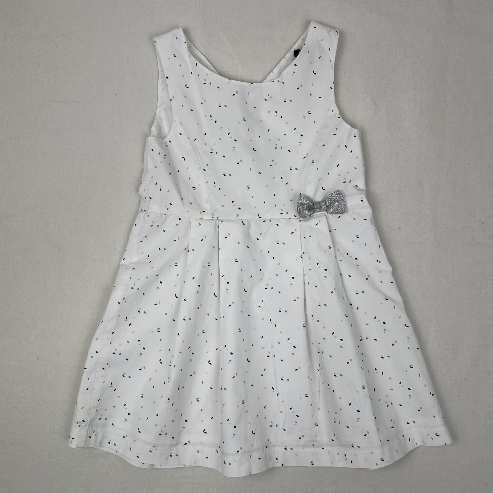 Autres commentaires : Robe blanche en toile, petite tâche jaune au dos de la robe. Petit noeud papillon devant. Imprimé à pastilles argentées, jaunes, bleu marine, et bleues. Doublure en tissu dedans. Boutons dans le dos
