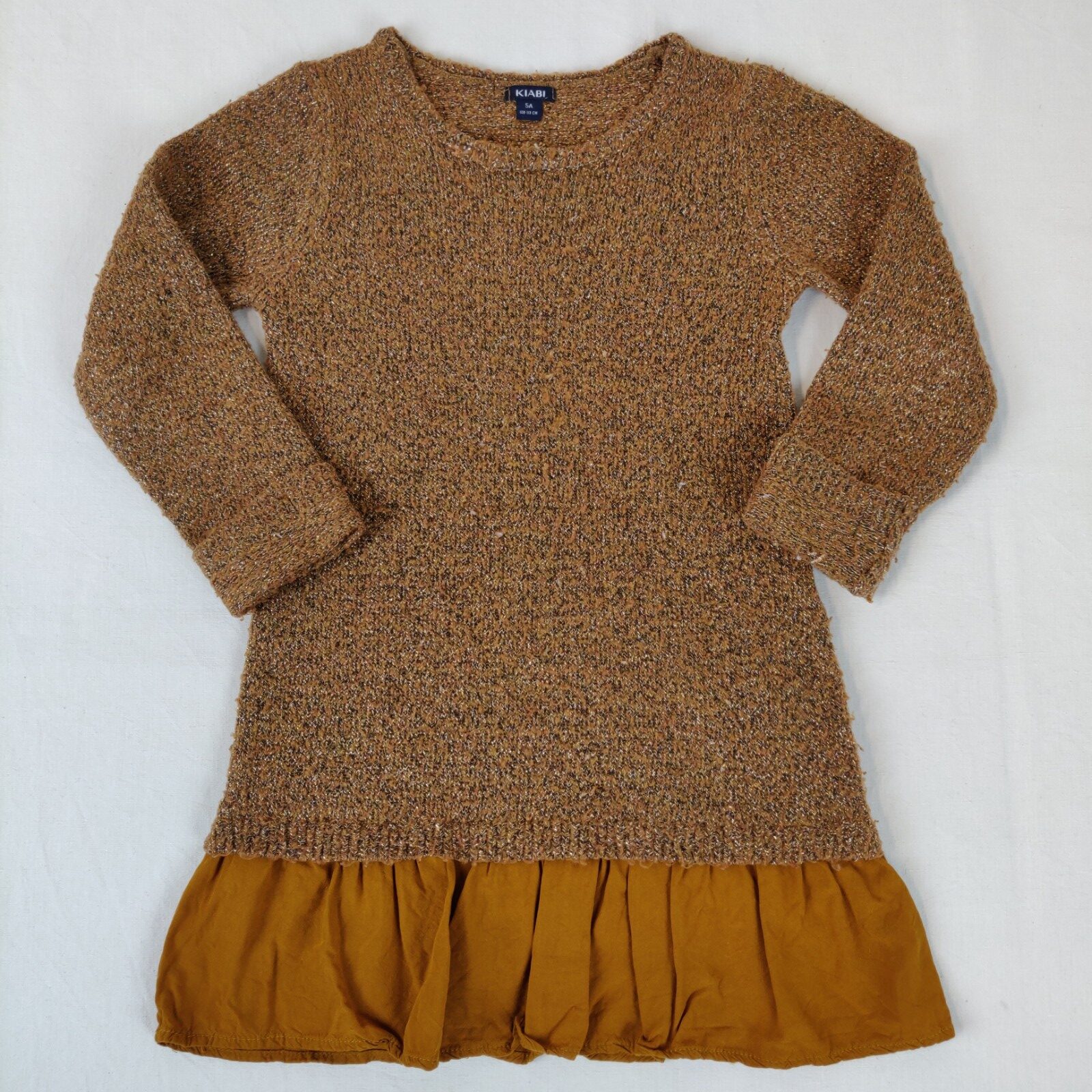 Autres commentaires : Robe à manches longues retroussées en mailles marrons et dorées. Partie jupe en tissu fluide ocre.