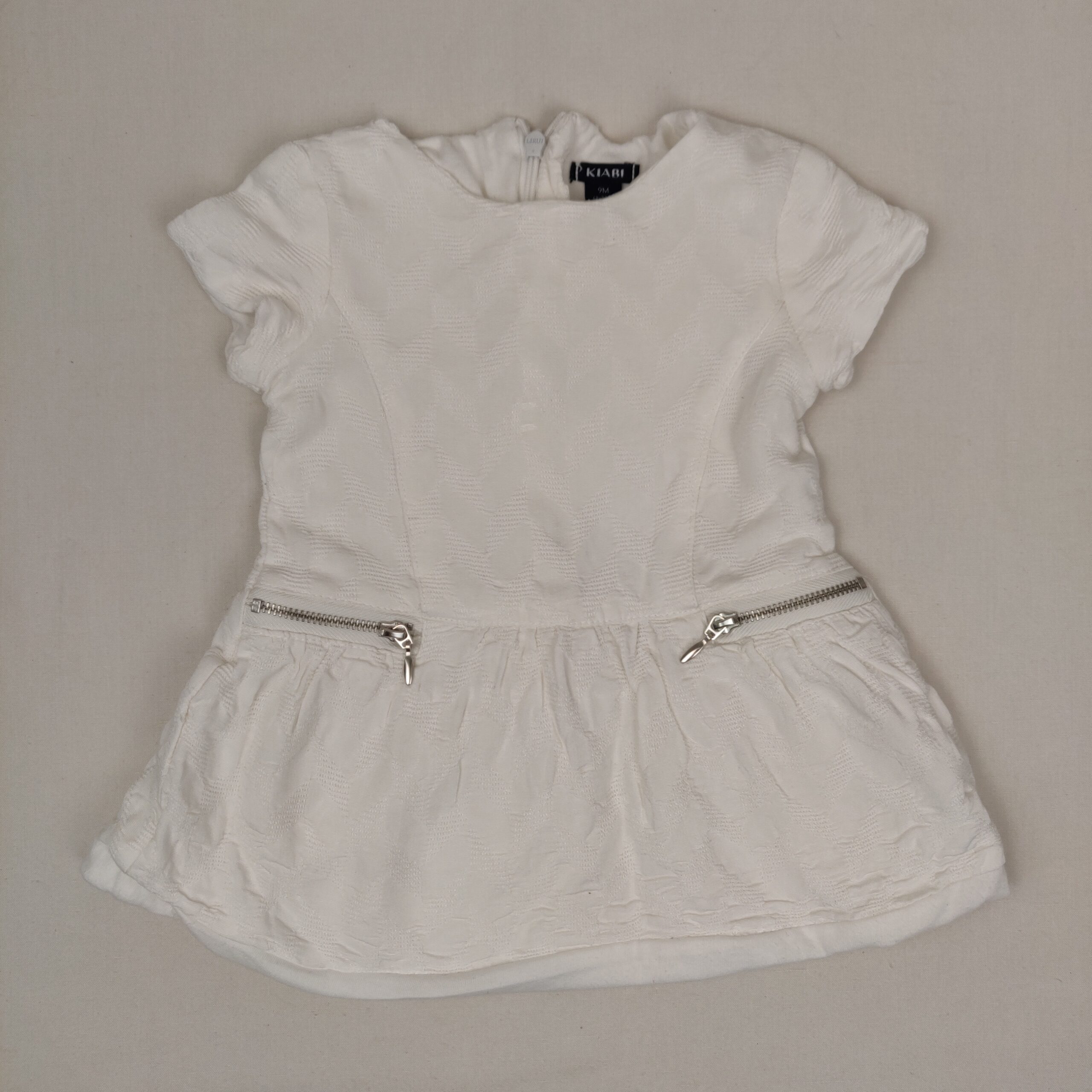 Autres commentaires : Robe blanche à manches courtes, idéales pour une cérémonie ou une fête, doublure blanche en 100% coton, fermeture au dos par zip. 9M mais taille estimée plutôt à 6 mois.