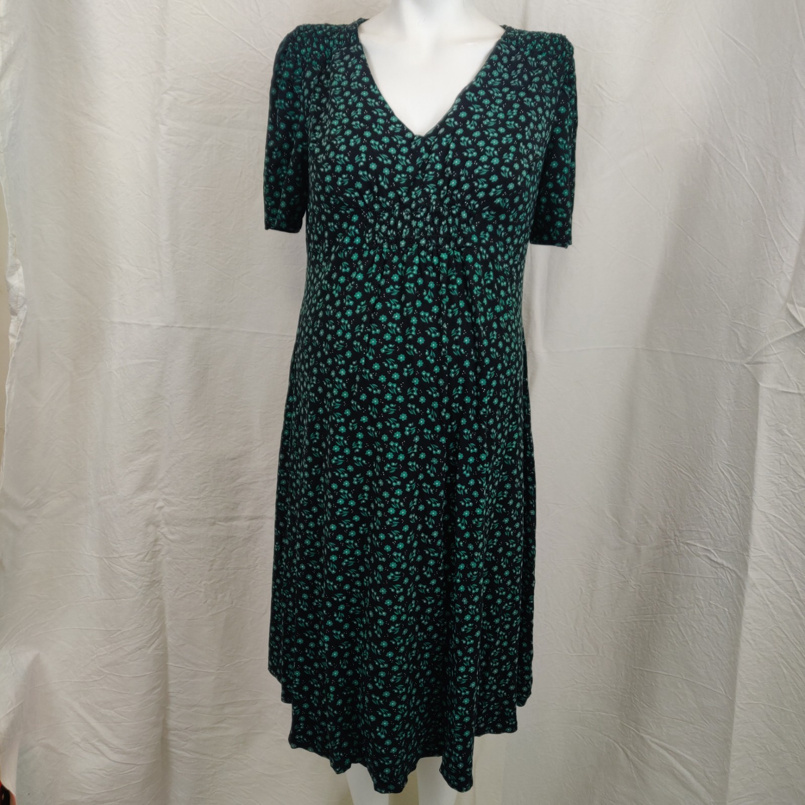 Autres commentaires : contient de l’eslasthanne. Robe fluide manche courtes, noire avec fleurs vertes et blanches, froncée sous la poitrine pour souligner le ventre
