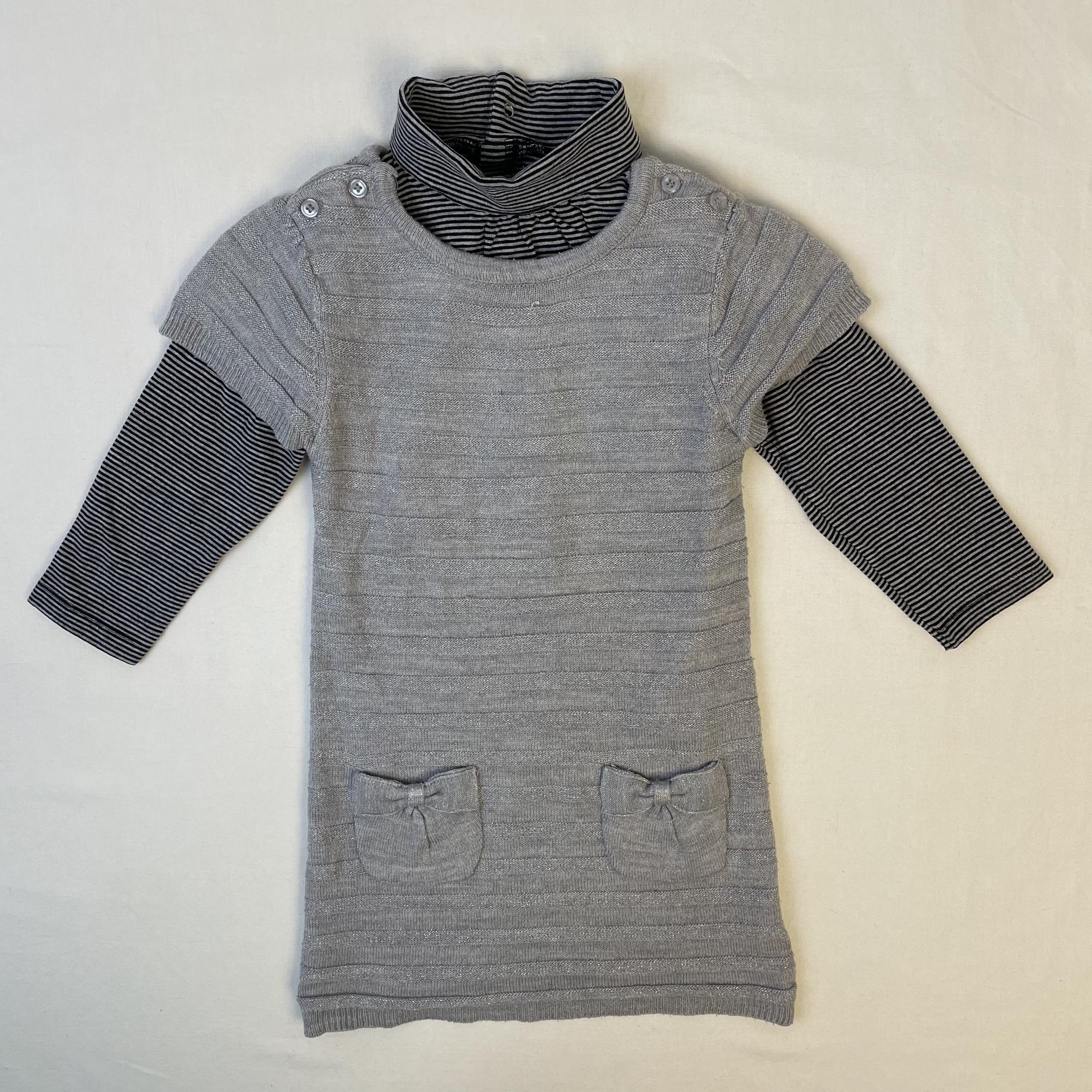 - Robe pull en mailles à manches courtes grise brillante, fermetures aux épaules par boutons.