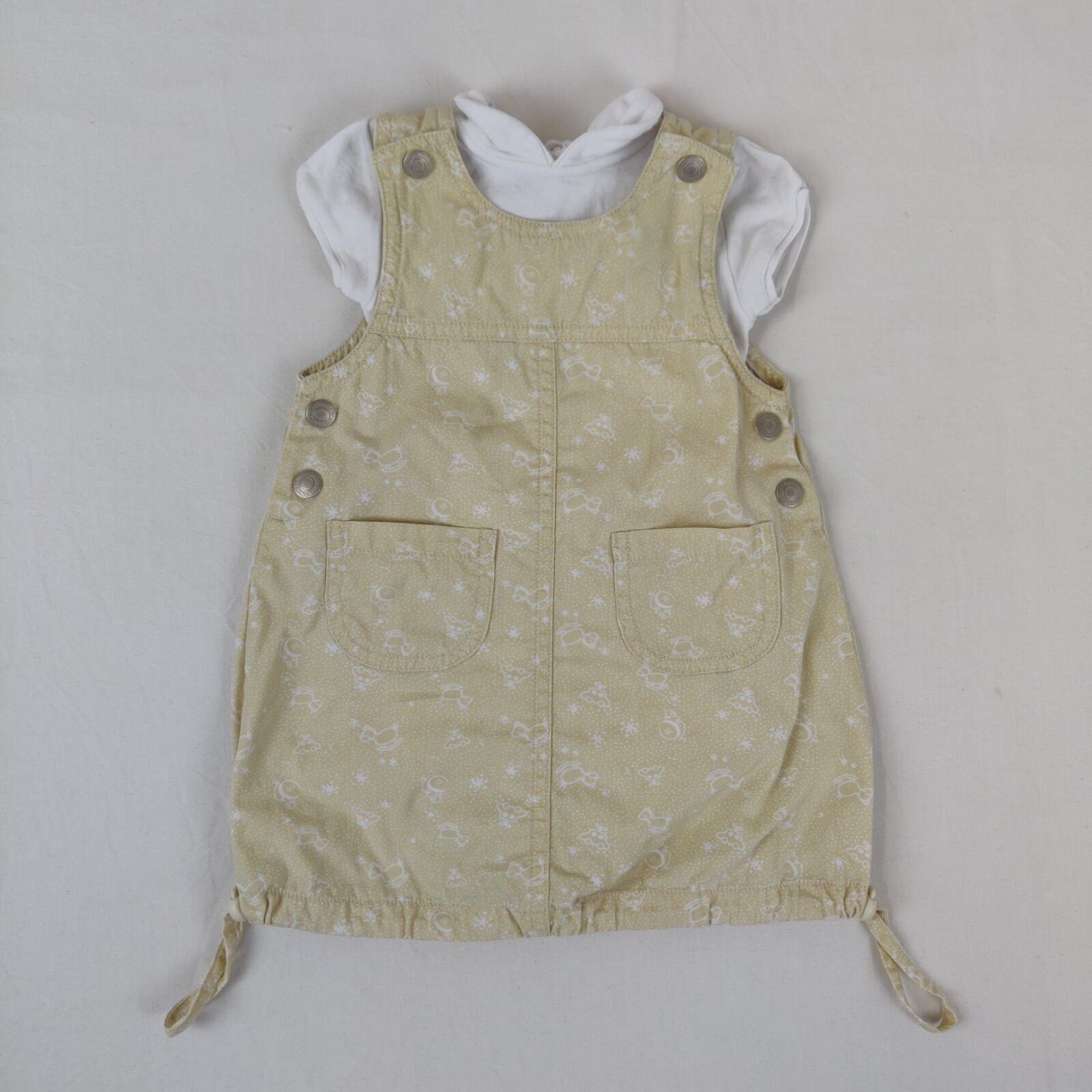 Autres commentaires : Robe à bretelles – jaune. Motifs variés blancs. Ouverture à une pression au niveau des bretelles. Ouvertures latérales à 2 pressions. 2 poches centrales. La jupe s’ajuste à l’aide de lanières et d’un poussoir. Un body à manches courtes Petit Bateau blanc offert avec des tâches noires au dos.