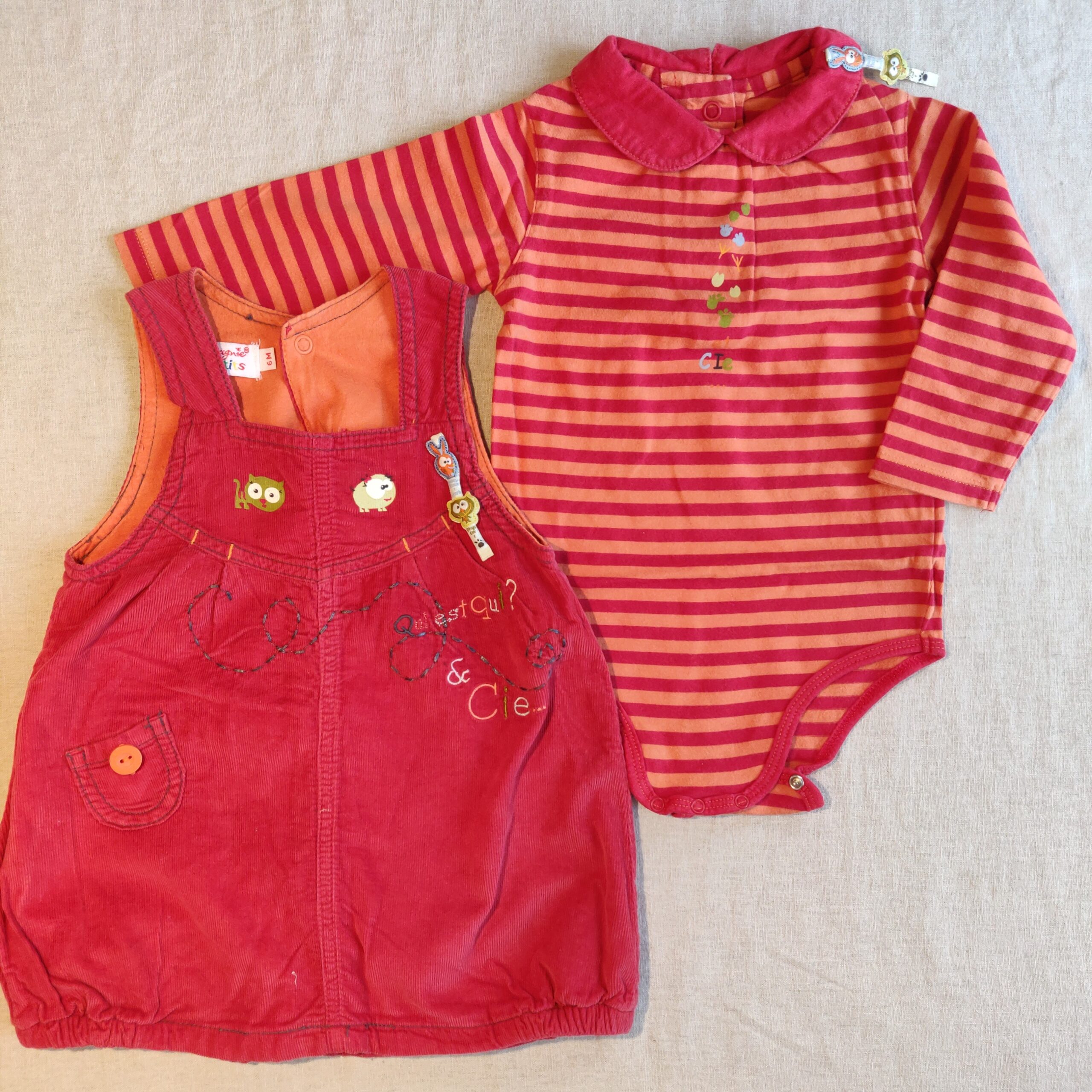 Autres commentaires : Robe sans manches en velours cotelé léger, motif « qui est qui & Cie »rouge orangée, doublure orange, et son body col claudine assorti rayé à manches longues.