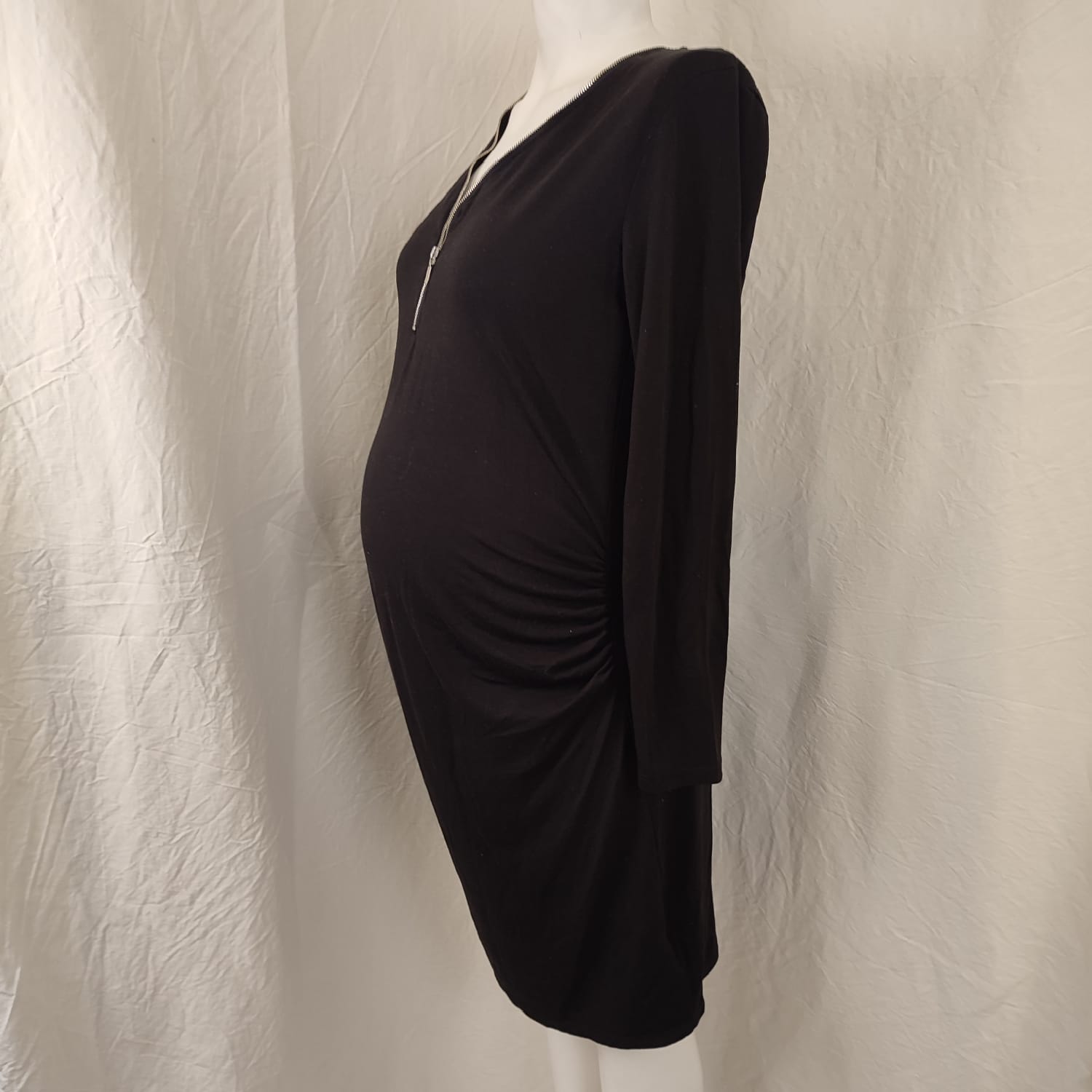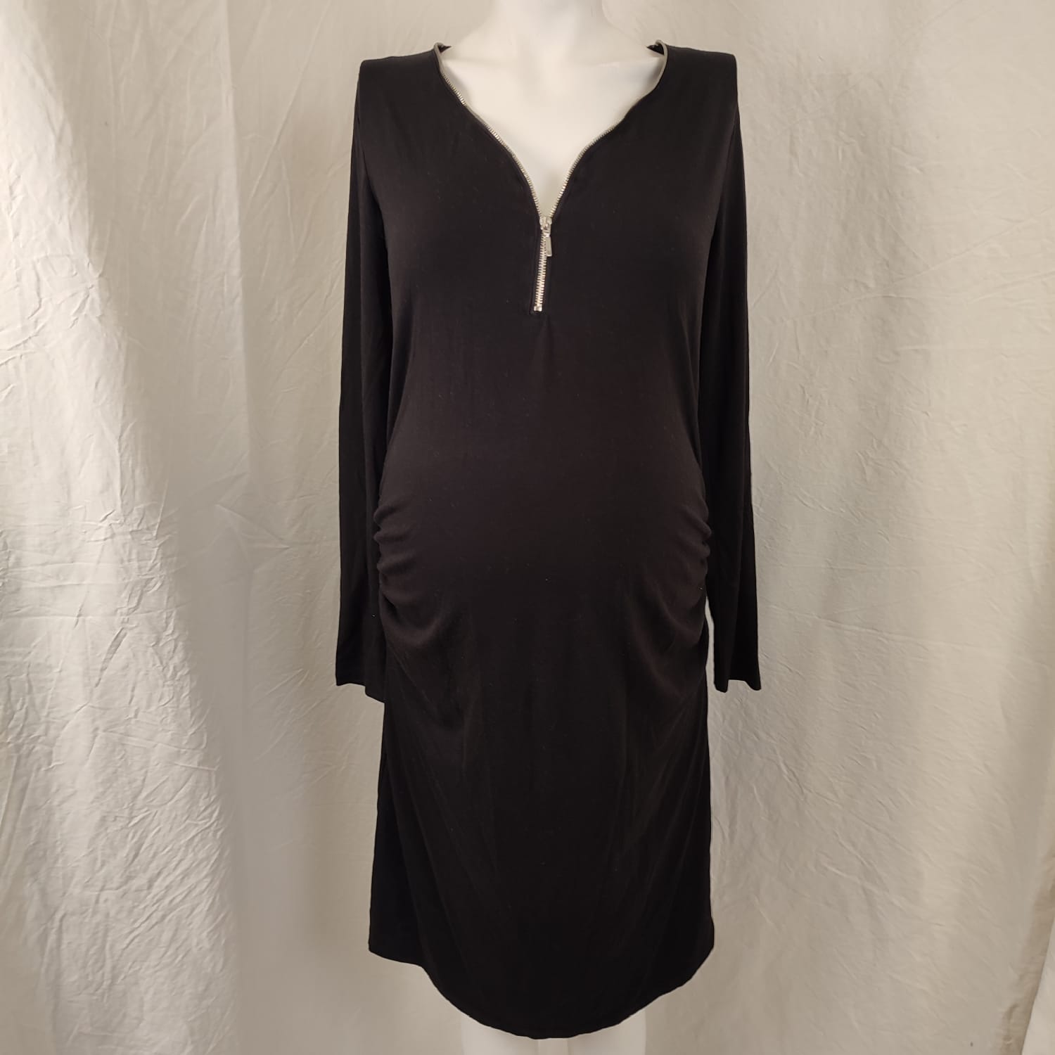 Autres commentaires : 30% viscose, 3% élasthanne. Robe manches longues noir uni, col V avec zip, dentelles au dos
