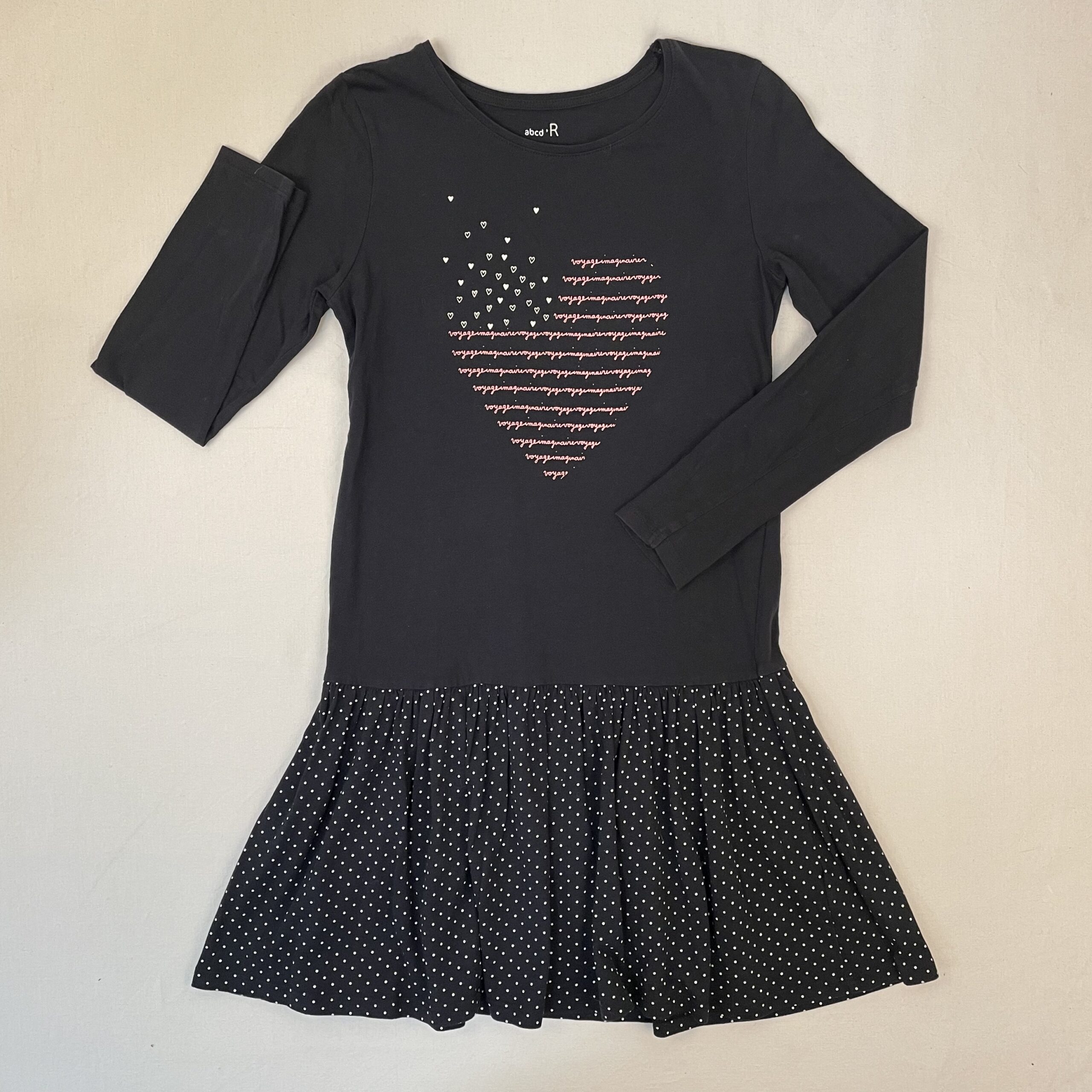 - Robe noire à manches longues, en bas tissu à pois, devant forme de coeur composée d’écritures et de mini coeurs, col rond.