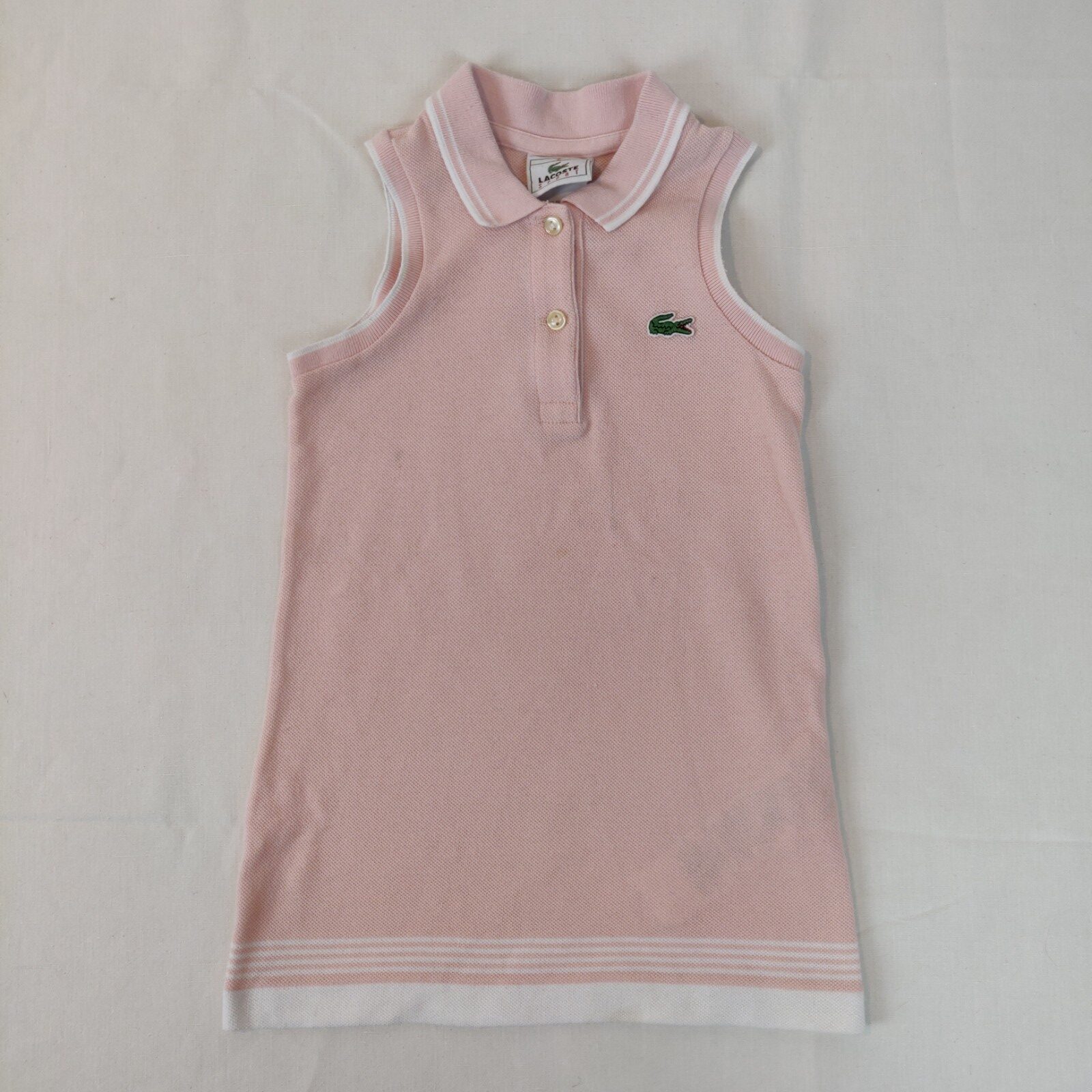 Autres commentaires : Robe sans manche – rose – ouverture centrale à partir du col à 2 boutons classiques. Liserés blancs sur le col classique et le bas de la robe. Motif central crocodile de la marque cousu. Quelques tâches légères sur le devant.