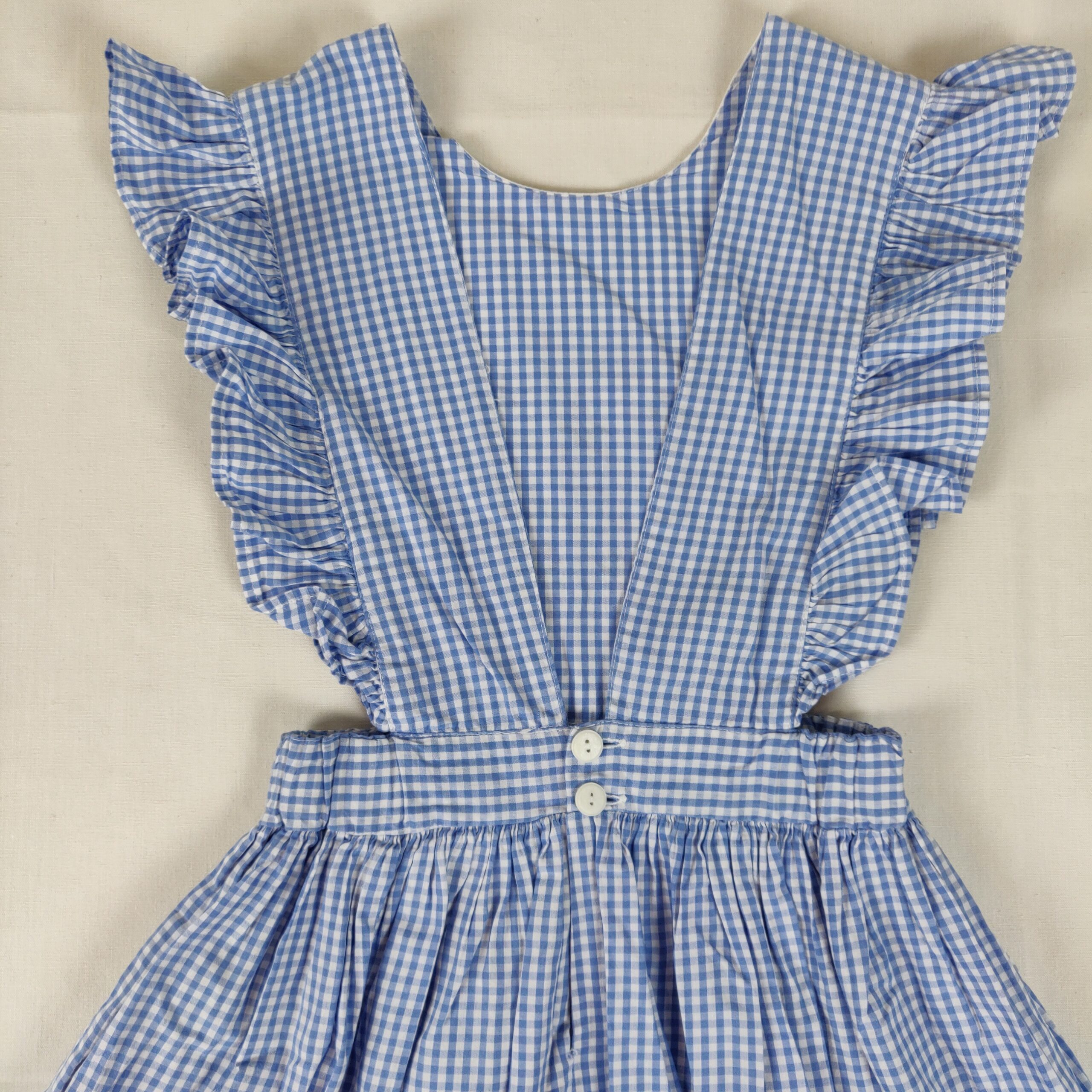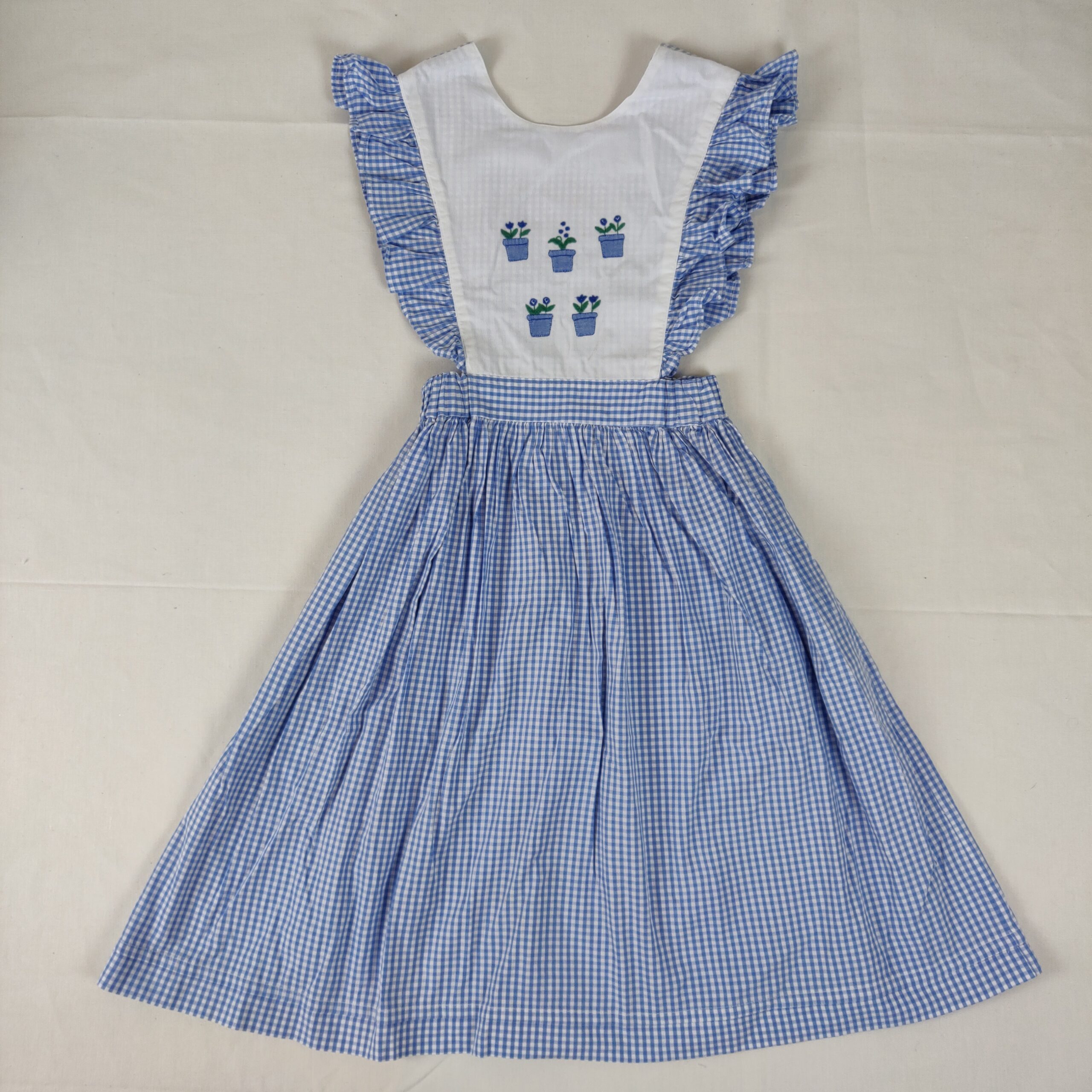 Autres commentaires : Robe chasuble bleue et blanches à carreaux, plastron blanc brodé avec des pots de fleur en denim et fleurs bleues et vertes, volants sur les côtés. Ceinture élastiquée, dos nu, deux boutons ferment la ceinture au dos. Revers au bas de la robe. Fabrication française.